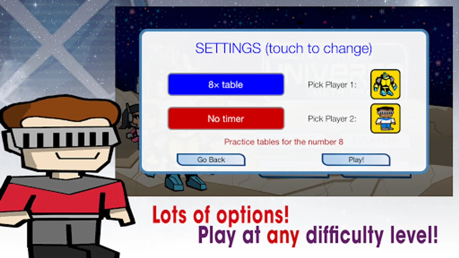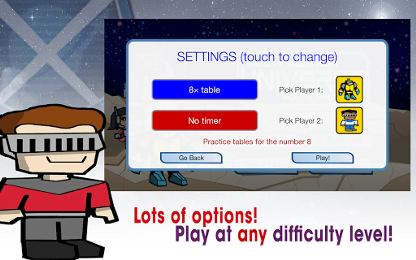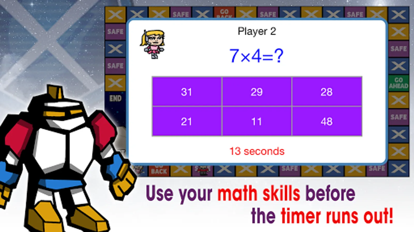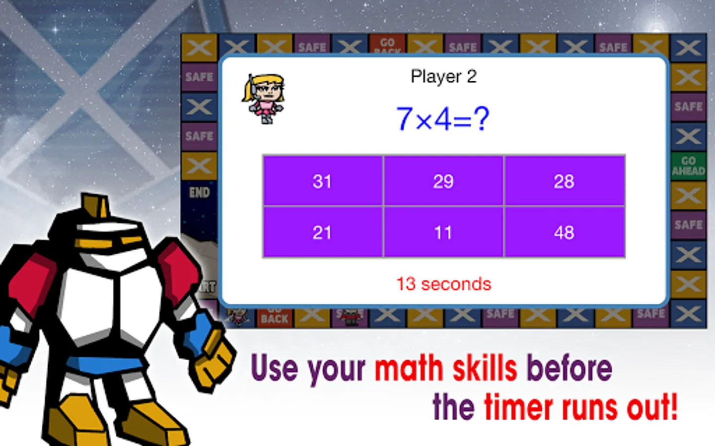 It's the Multiplication Universe! Become the hero of the galaxy by practicing your multiplication tables! Advance across the board and answer as many multiplication questions as you can. Play against the computer or against a friend. Great for all ages who want to challenge their math skills.