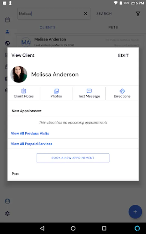 View your clients’ pets’ grooming or medical notes, see what products and services the client has purchased in the past, all their upcoming appointments, send them a quick text or e-mail right from the app, or even get a map to their address if you’re a mobile pet groomer. DaySmart Pet™ is a useful pet grooming client manager and makes it easy to keep up-to-date and in contact with all of your pet salon’s clients.