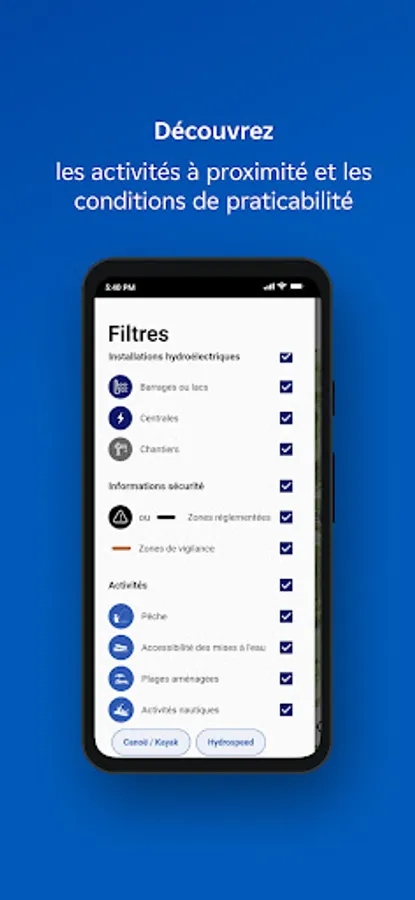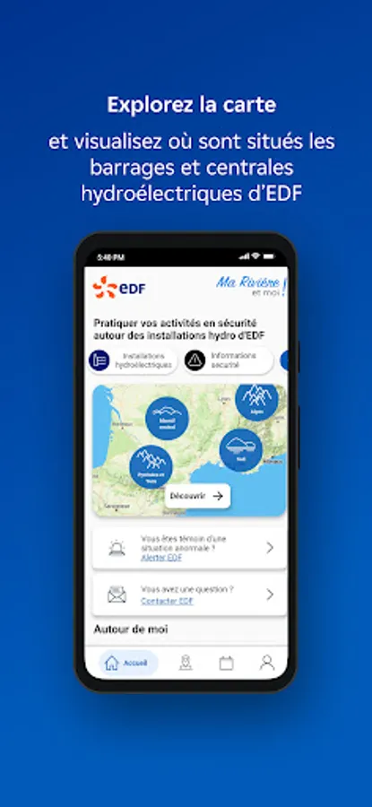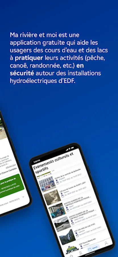 My river and me is a free application that helps users of rivers and lakes to practice their activities (fishing, canoeing, hiking, etc.) safely around EDF hydroelectric facilities.