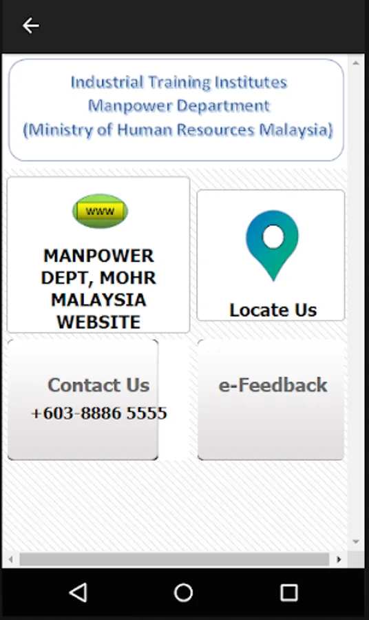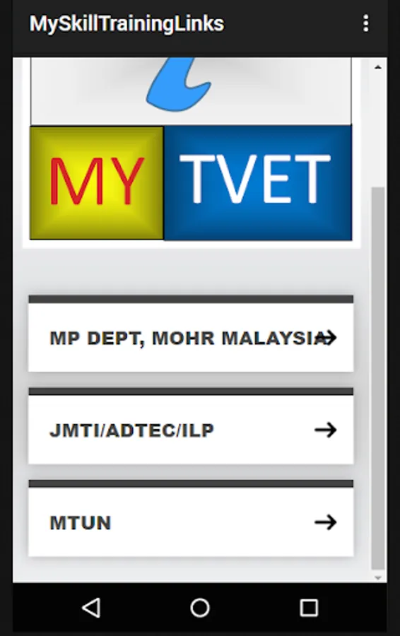 This application is very usefull for the user who want to find out more about the TVET Institutions in Malaysia and their skill training programmes because the application is already link to TVET institutions such as Manpower Department Training Institutions websites which is under the Ministry Human Resources Malaysia , one of the major Public Skill Training providers in Malaysia and also Malaysian Technical University Networks (MTUN) which comprising four universities; Universiti Tun Hussein Onn Malaysia (UTHM) , Universiti Teknikal Malaysia Melaka (UTeM) , Universiti Malaysia Pahang (UMP) and Universiti Malaysia Perlis (UniMAP) that provide opportunities for TVET Students who have or holder of Malaysia Vocational Diploma (DVM), Malaysia Skill Diploma (DKM) and Malaysia Skill Advance Diploma (DLKM ) to further studies in Bachelor Of Technology Degree (BTech) proggrames in spesific technology fields.
