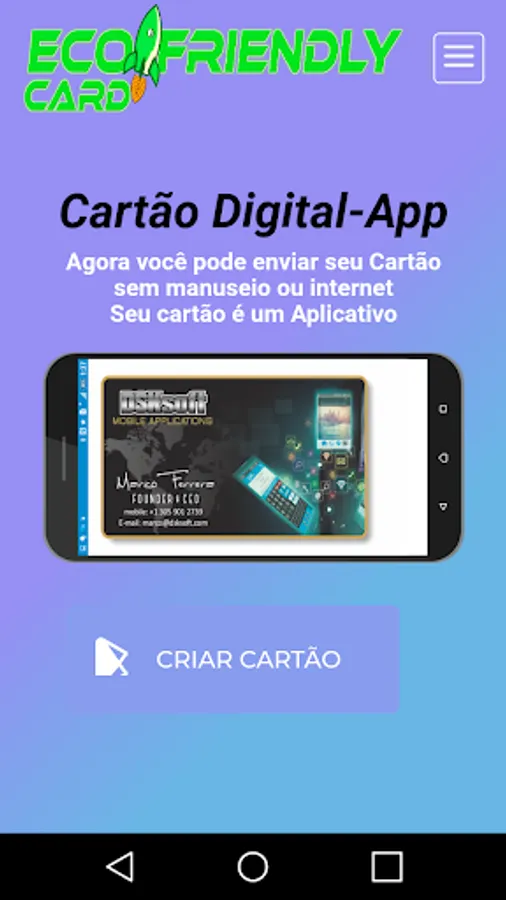Nosso CEO Marco Ferreira criou a evolução para seu Business Card e muito mais barato, não se trata de um App Site onde voce precisa de um Login para acessar seu App em um servidor de internet, nosso ECOFRIENDLYCARD trabalha independente e off-line para cada individuo Business Card.