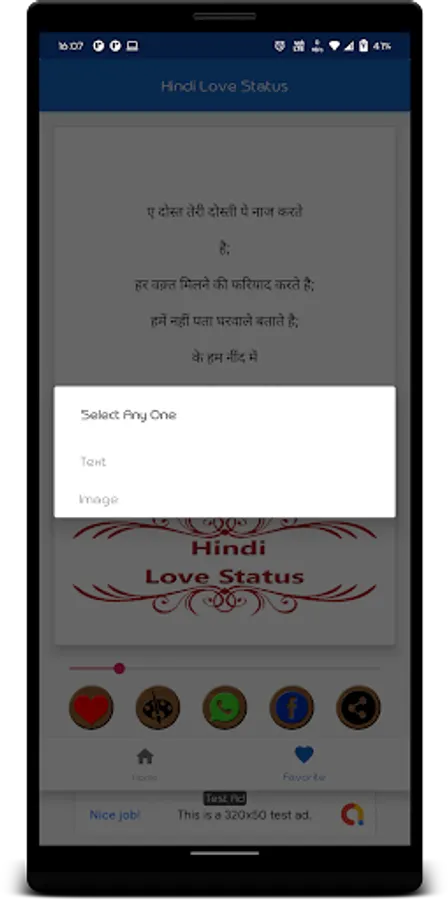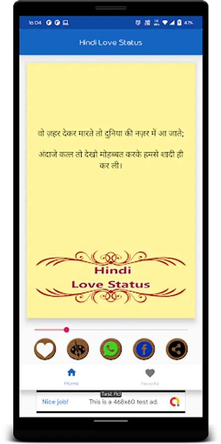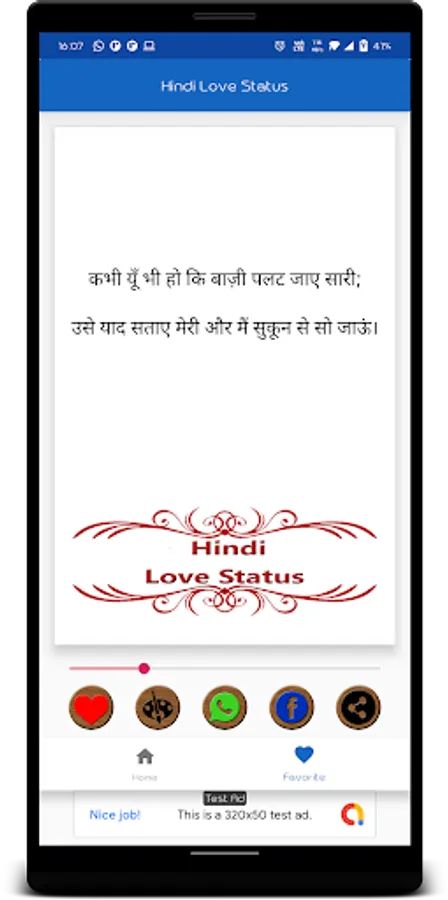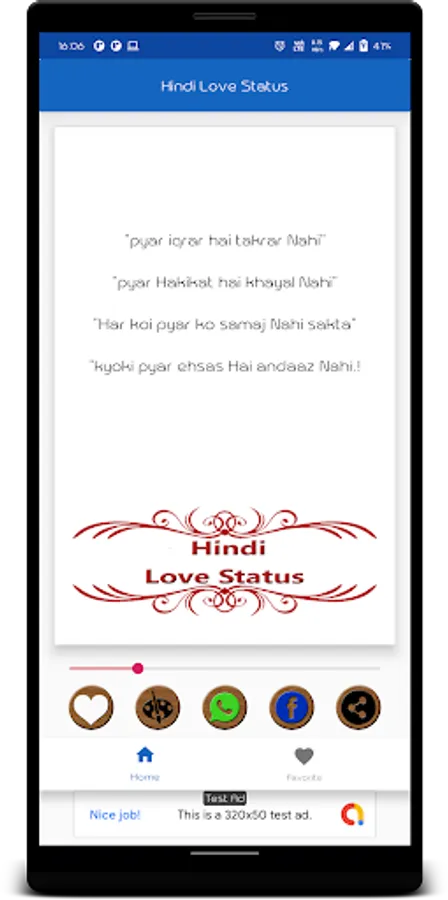This application contain best and Latest Love Status and Messages in Hindi Language. It has huge collection of Love statuses for all occasions for quick update status in social sites and for any chat application etc. You can read any Love Status and share easily to everyone (any social media).In this great this application have each and every categories of status.