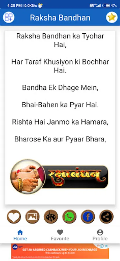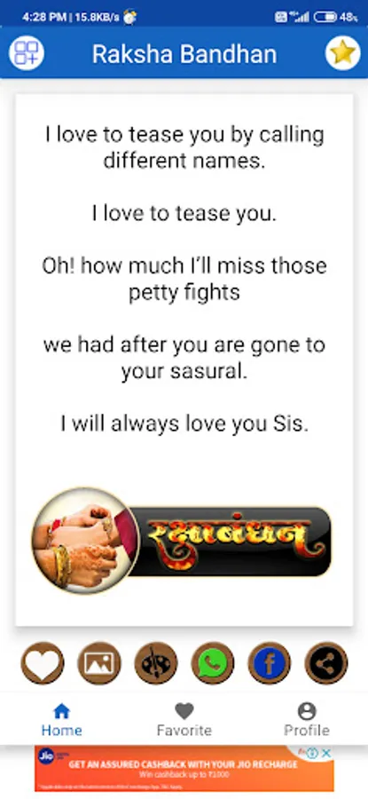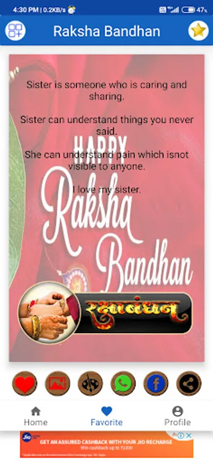 Raksha Bandhan 2021 application presenting special Quotes and Customize photos for Rakhi Festival. Use this Quotes and photos in your chat with your friends, family members and relatives.