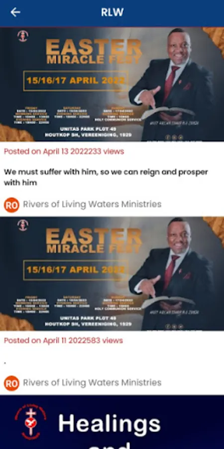 Rivers of Living Waters Ministries was founded by Archbishop Stephen and Pastor Seabi Zondo on the 24th September 1988, at Zone 3 Sebokeng with a total membership of three.
