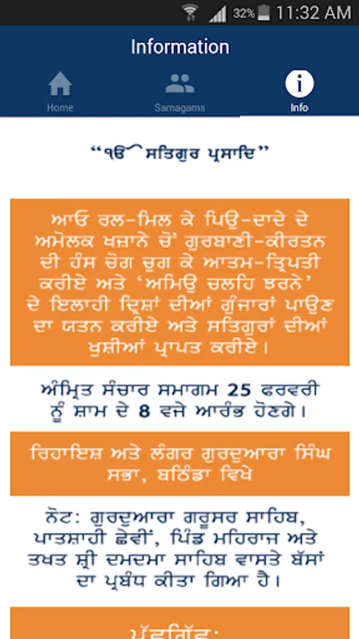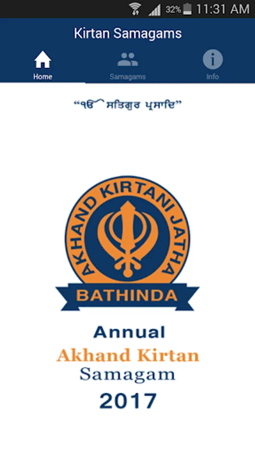 ਸਾਧ ਸੰਗਤ ਜੀ, ਅਖੰਡ ਕੀਰਤਨੀ ਜੱਥਾ ਬਠਿੰਡਾ ਵੱਲੋਂ ਸਾਲਾਨਾ ਕੀਰਤਨ ਸਮਾਗਮ 2017 ਦੇ ਸੰਬੰਧ ਵਿੱਚ ਜੋ ਪ੍ਰੋਗਰਾਮ ਉਲੀਕੇ ਗਏ ਹਨ ਉਹਨਾਂ ਦੀ ਜਾਣਕਾਰੀ ਲਈ ਇਹ Android App ਤਿਆਰ ਕੀਤਾ ਗਿਆ ਹੈ । ਸੋ ਆਪ ਜੀ ਸਮਾਗਮਾਂ ਵਿੱਚ ਵੱਧ ਤੋਂ ਵੱਧ ਹਾਜਰੀਆਂ ਭਰ ਕੇ ਗੁਰੂ ਸਾਹਿਬ ਦੀਆਂ ਖੁਸ਼ੀਆਂ ਪ੍ਰਾਪਤ ਕਰੋ ਜੀ ।