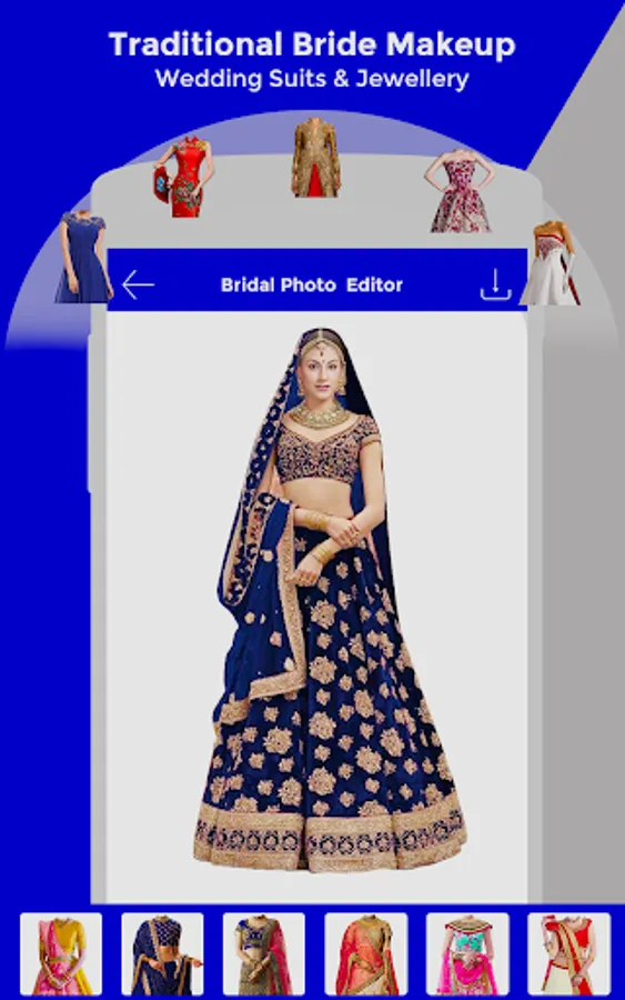 Traditional Indian bridal makeup app allows all skin color girls like dark skin, brown skin, dusky color skin, fair skin, they can check their marriage makeup looks, bridal eye makeup looks. Even you are plus size figure by using Indian wedding saree changeryou can check how you look in red wedding saree, yellow or golden wedding color saree.