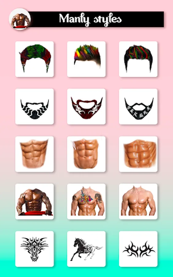 2. select six pack , Beard, Mustache, Hairstyle, Photo Suit, Tattoo from our catalog gallery and blend them onto your body with seekbar adjuster.