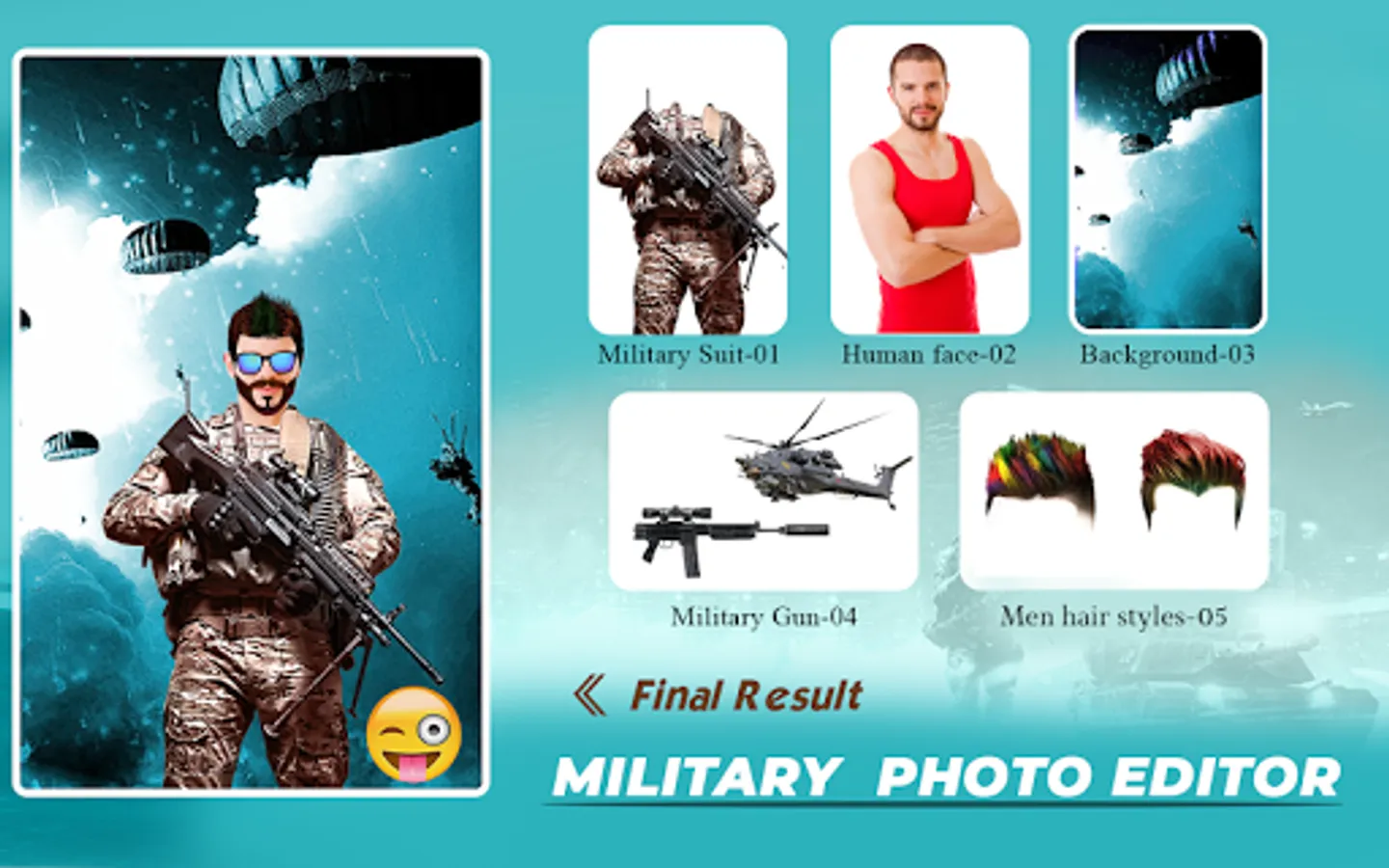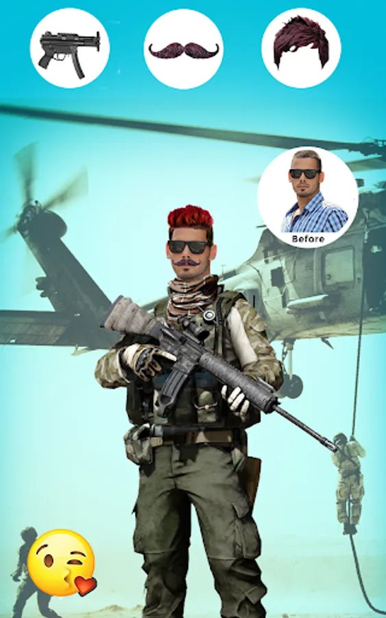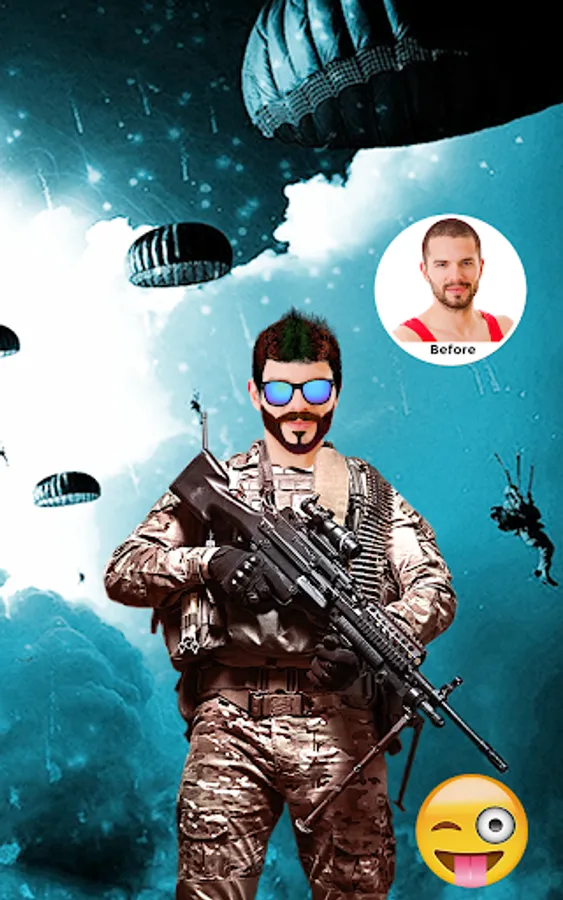 Army Photo App provides military Photo frames in which you can add your own picture or selfie and turn your image into an army soldier. The app is to provide army dress template for both men and women. It also provides army stuff sticker like Army Jacket, gun, Ak 47, grenade Army cap, bazooka gun, bomb, military hairstyles, mustaches or mooch, Beards, remove blemishes and By the help of Army Photo Background feature, you can add military or war backgrounds to your picture.