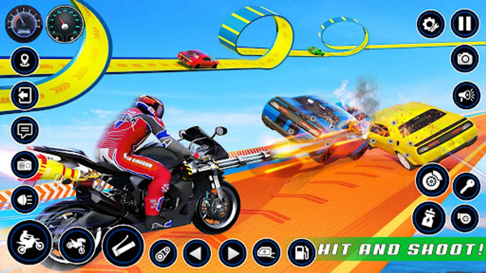 Hit muscle car & reach to the finish point on your stunt bike