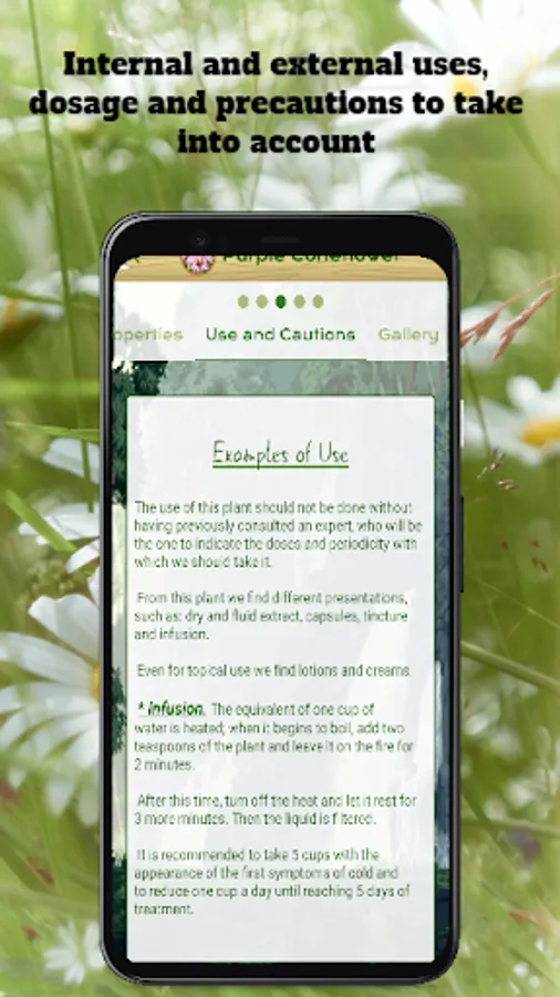 You will find the characteristics of each plant, how to collect them, therapeutic use, its internal and external use, dosage and precautions that must be taken into account.