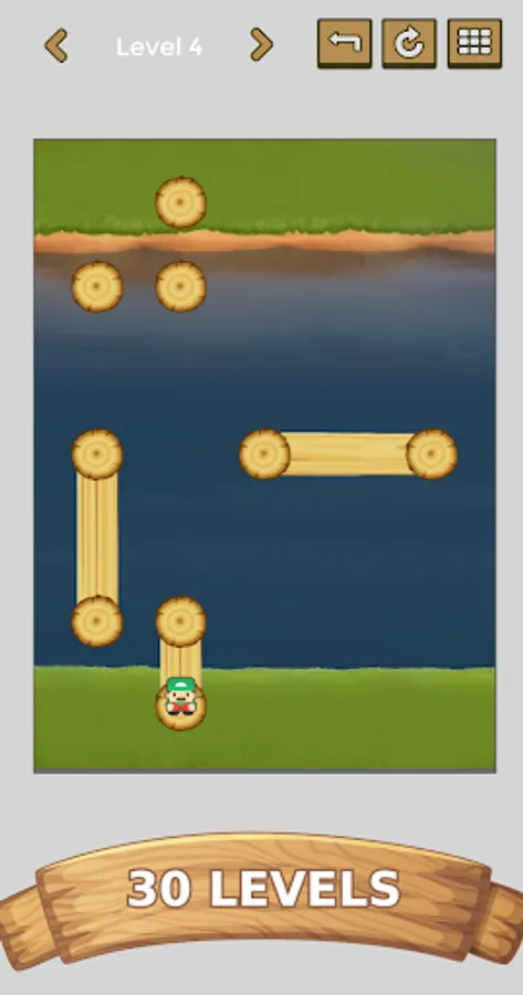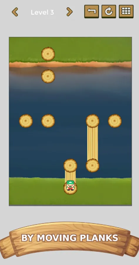 Puzzle game about crossing a river filled with tree stumps using a planks.