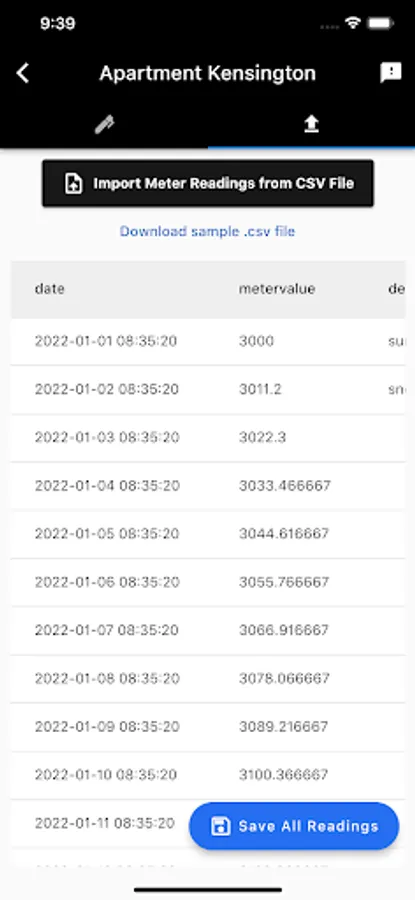 You can add your electricity meter values either manually by typing or you can accelerate or automate this process by uploading a csv file.