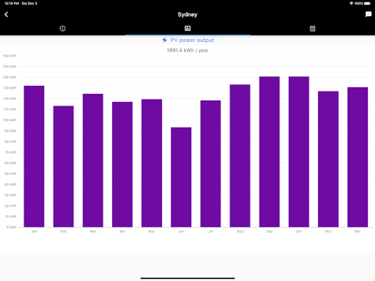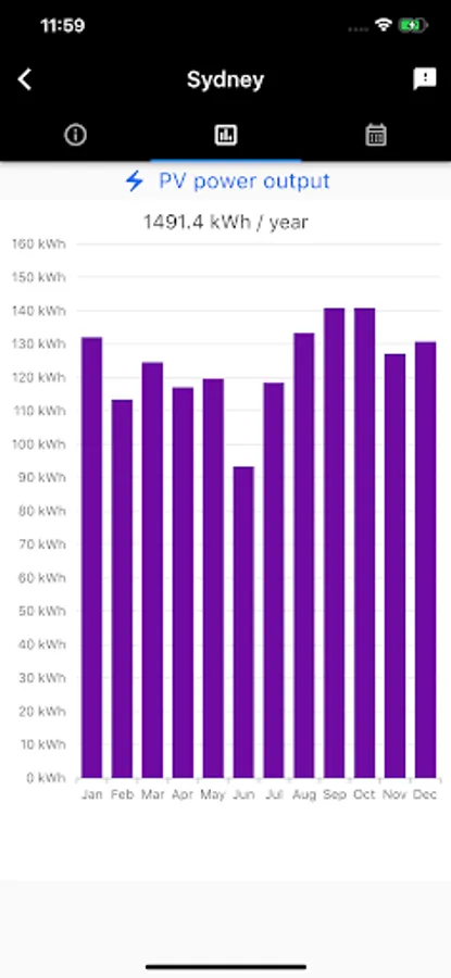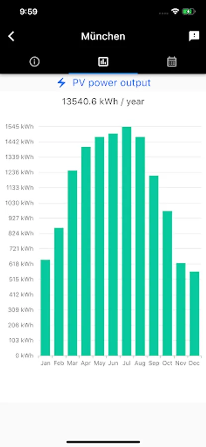 Yearly and monthly average values of photovoltaic electricity / power output by your PV system based on your installed capacity in kWp and your defined location.