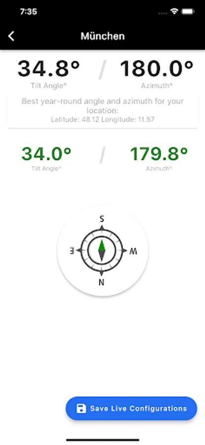 Use your device to align your PV system to the pre-calculated values. We show you the tilt and azimuth based on your real-time position and orientation.