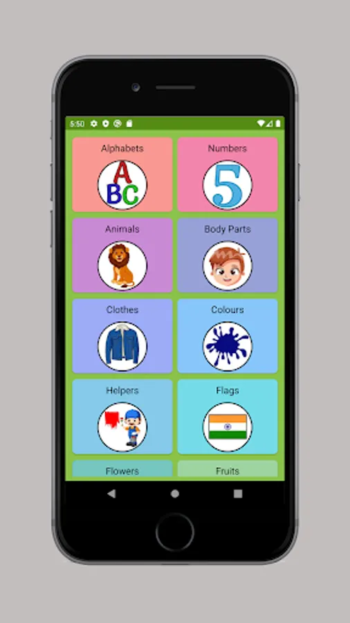 There are 28 different categories included like alphabets, numbers, food, flowers, cloths and many more. Each category has 40 pictures with sound and its spelling. Your kids can learn English first words themselves without any help. They will really enjoy this application.