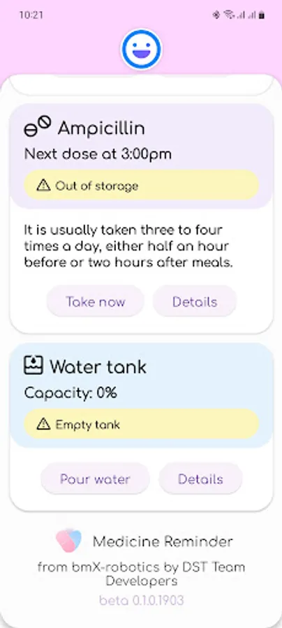 The device will link with the phone via a dedicated application to control the device, customize information and medication time, view the remaining amount of medicine/water, medicine box humidity and system status of the device. bag. The dedicated application interface is developed specifically to make it easier for users to use and interact with the device, the application also has its own additional features for the device such as reminders to take medicine right on the phone, standard reminders. medicine when going out, and many more features on both the device and the app.