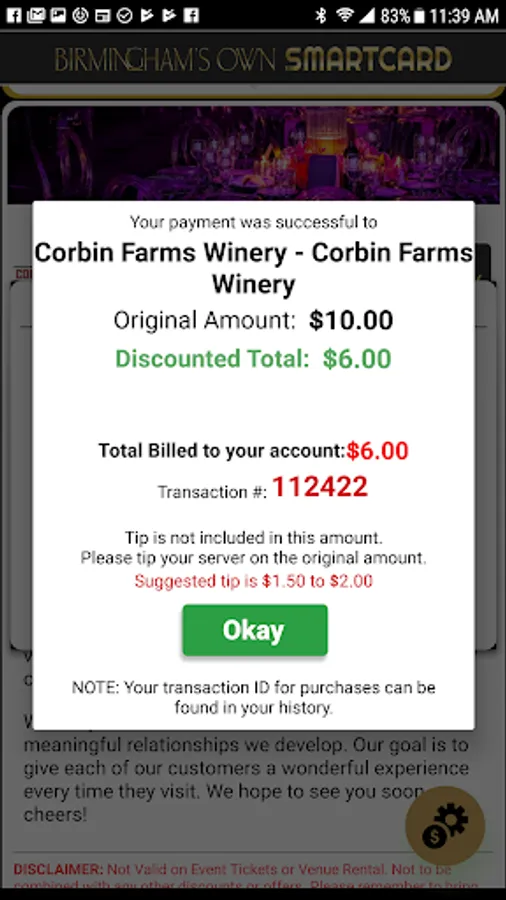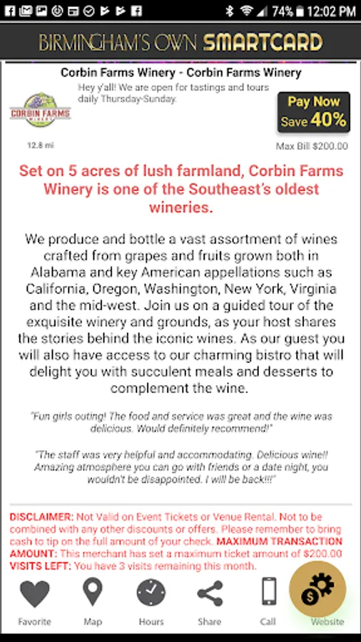 PAY NOW OR ADD FUNDS TO YOUR SMARTCARD ACCOUNT: After creating your account, link the credit or debit card you want to use. You can add funds to your account in advance or simply use the “pay now” feature to fund the exact amount of your bill when you pay your check. Be sure to tell your cashier you’re using the Bhams Own App, then launch the app and enter the exact transaction amount. Savings will be automatically applied to your check! Provide the participating merchant with your transaction number once you’ve settled your tab.