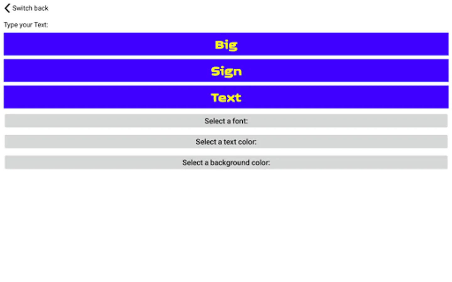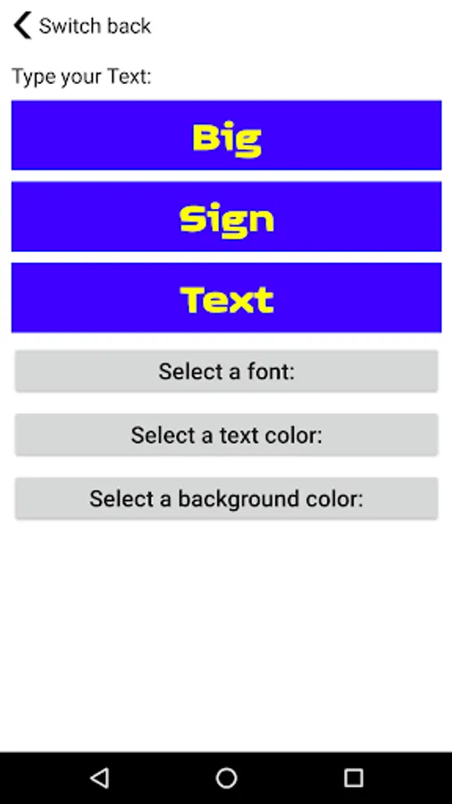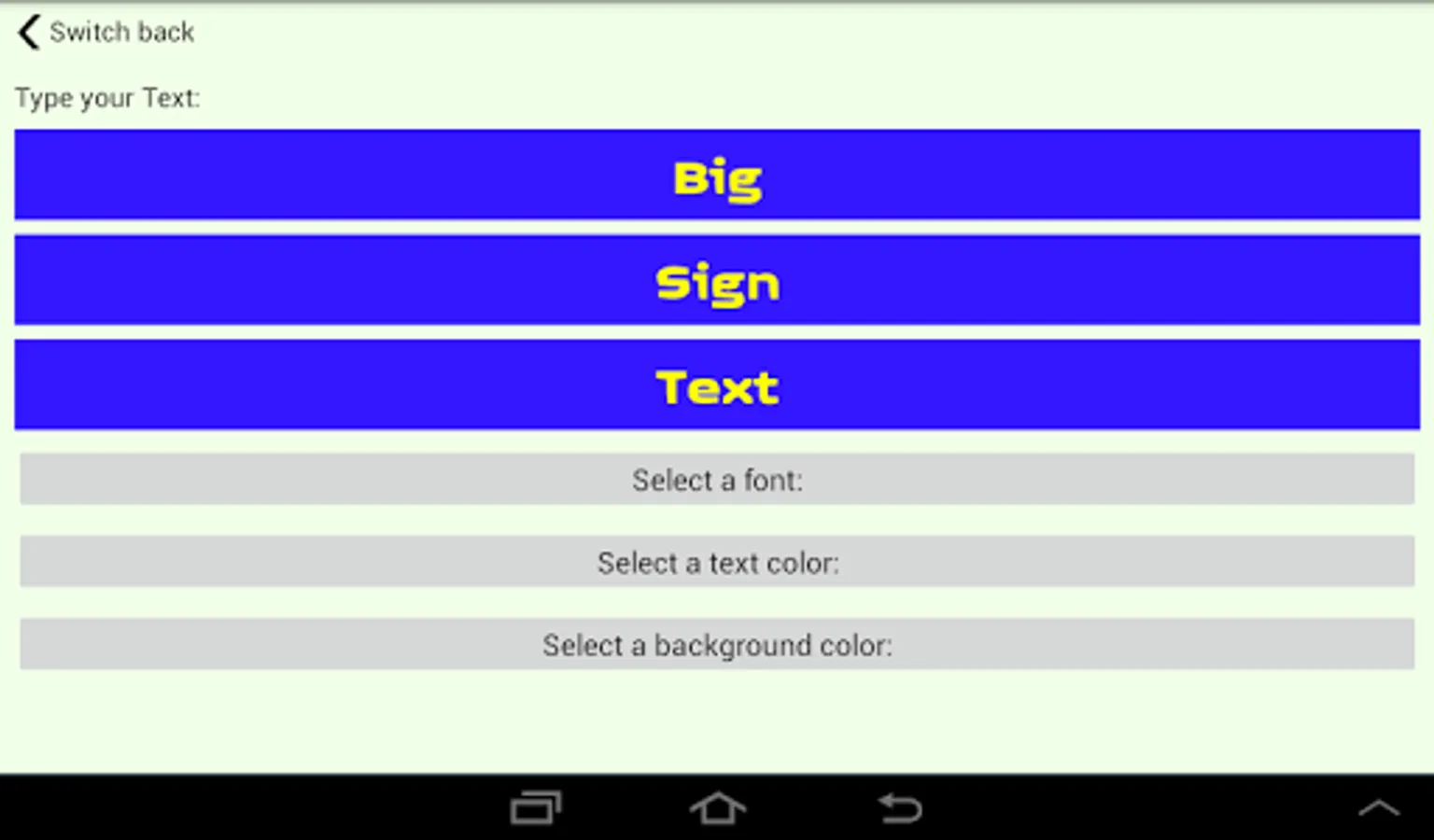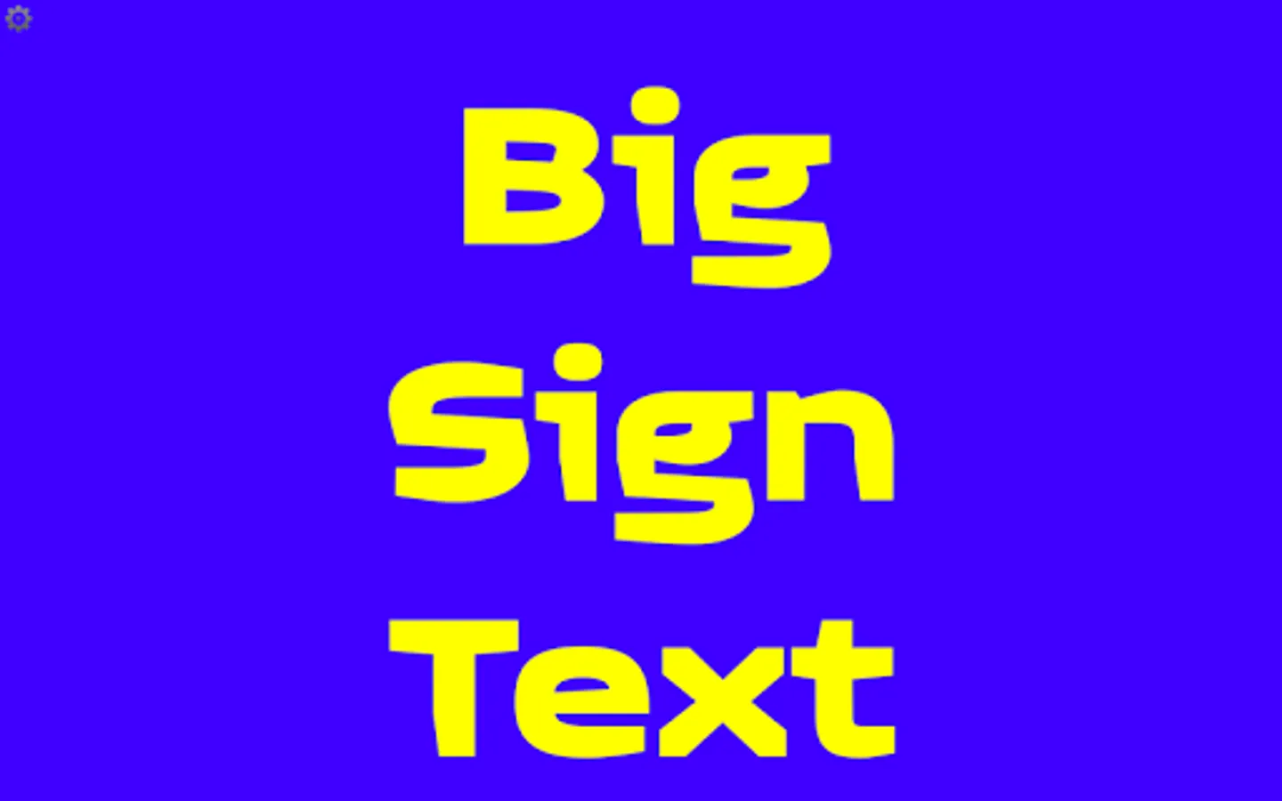 Big Sign brings a very easy and funny app to your Android Device. Just enter a text, chose from fonts and combinations of font and background color and your done. Big Sign turns auto-lock off, so that you can show your text as long as you wish.