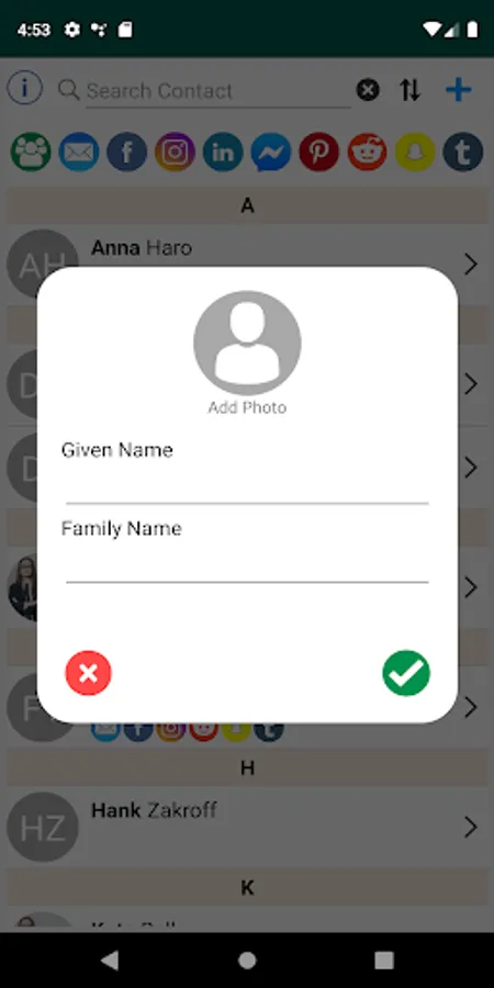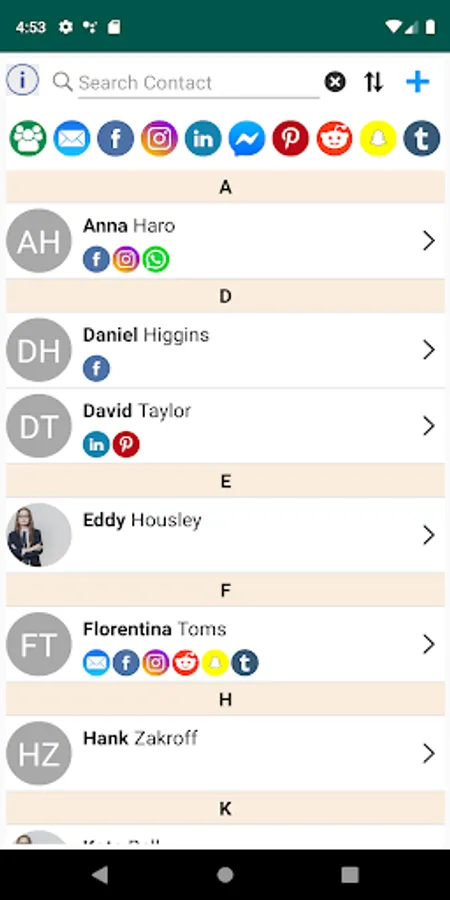 Based on this, we have formulated a simple but interesting idea – an interactive contact list that will contain links to every page relevant to a certain person on various social networks, their email address, and messengers.