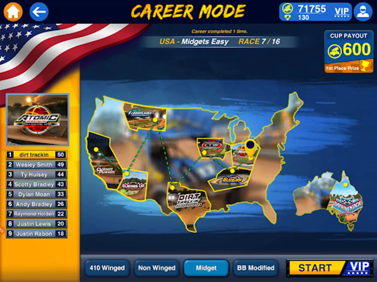 Career Mode: Race your way from the United States to Australia in a grueling 108-race mode, in which you must win each series to advance to the next. Simple, win and you're in. Be an outlaw to win your way through the ranks from Midgets, and Big Block Modifieds up to Full Blown 410 Wing Sprints, and unlock rewards!