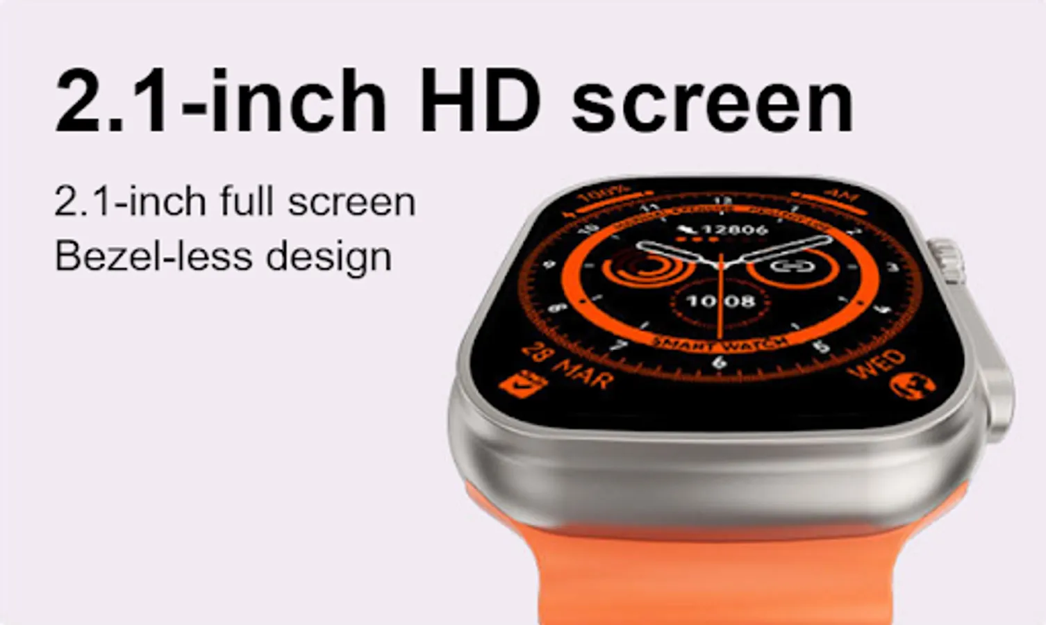 What makes this new smartwatch better than other competitors is a new improvement that includes hardware, software, and design, and the main selling point is the 2.1-inch Ultra Wide Screen with a flat design and 49mm 1:1 Case which makes it the most exact copy of the original, and built-in 7 watch faces including exclusive to the new Apple Watch, also has Health & Fitness Functions, with the possibility to Making Calls, Multifunction NFC and Voice Assistant, even Quick Action button on the side, and there are many more. In short, you will get the latest technology that you will not find in any other smartwatch.