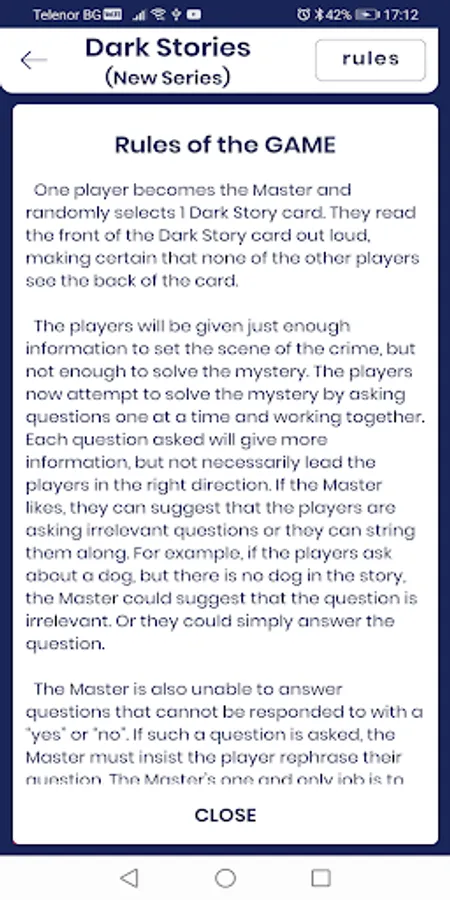 One player is the master. The master knows the answer to the riddle and must answer questions. The master takes a card from the stack, reads the story on the front, and asks, “What do you think happened?” The master, of course, knows the answer, but keeps it to him or herself. The other player or players are the detectives, and begin asking the master questions. The questions must be posed so that the master can reply with a simple “yes” or “no”. With skill and perseverance, the detectives will draw closer to the solution until they finally find what exactly happened.