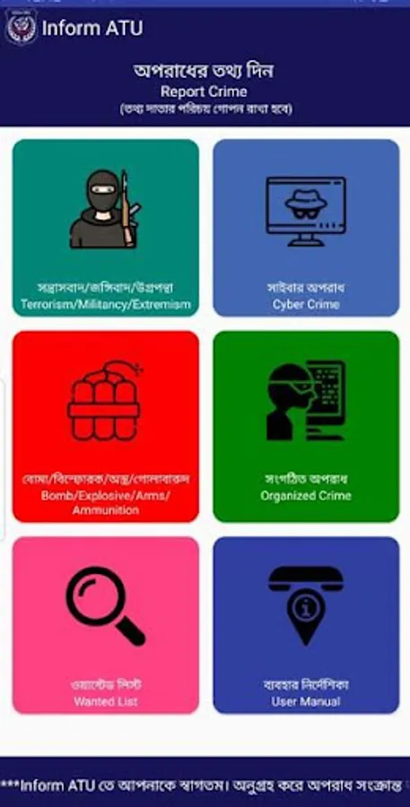 সন্ত্রাসবাদ/জঙ্গিবাদ/উগ্রবাদ, সাইবার অপরাধ, অস্ত্র/গোলাবারুদ/বোমা/বিস্ফোরক, সংঘবদ্ধ অপরাধ, আন্তঃদেশীয় অপরাধ, মোস্ট ওয়ান্টেড ব্যক্তি সর্ম্পকে নিজের পরিচয় গোপন রেখে “Inform ATU” অ্যাপসের মাধ্যমে পুলিশকে তথ্যাদি প্রেরণ করতে পারবেন।