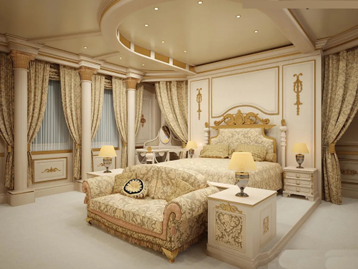 A bedroom must have a bed and some accessory furniture items in it. It can either be a double bed or a king-size bed. A comfortable couch in front of the bed, a delicate and a simple dressing table with drawers, a table, and a sofa.