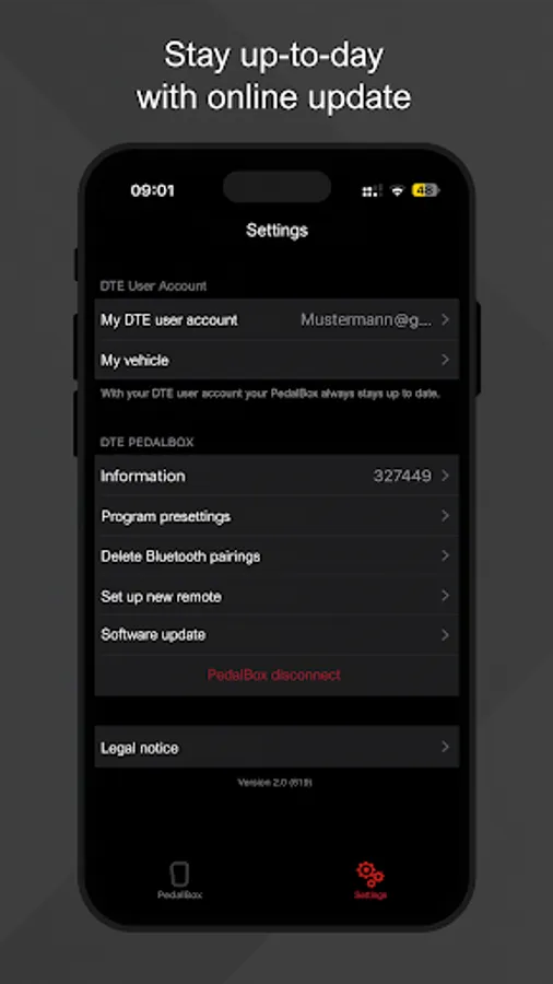 The PedalBox App is developed and distributed by DTE Systems GmbH, one of the world's leading manufacturers of innovative performance enhancement and accelerator tuning systems. The range of functions of the PedalBox App may vary depending on the PedalBox system (hardware) used, the smartphone and the vehicle. A free DTE Systems account is required to use the PedalBox App.
