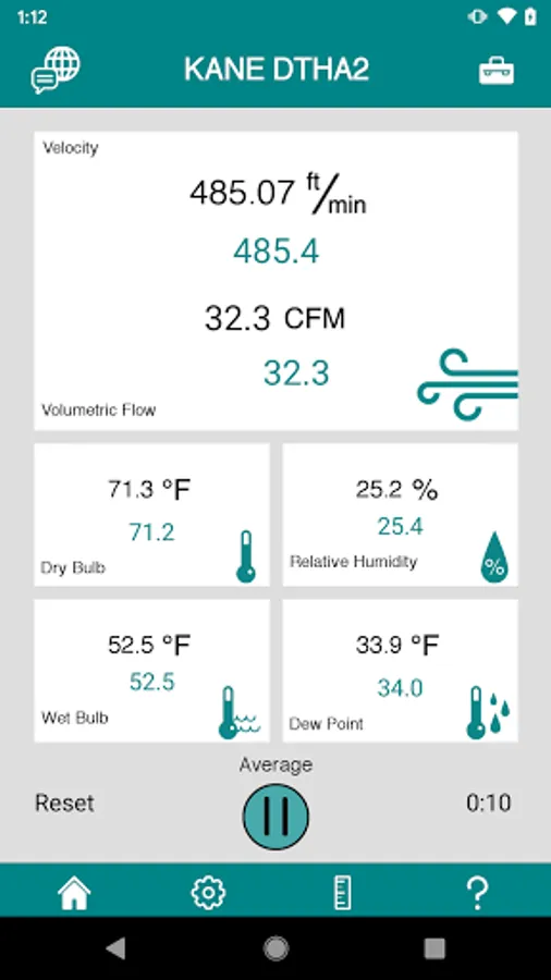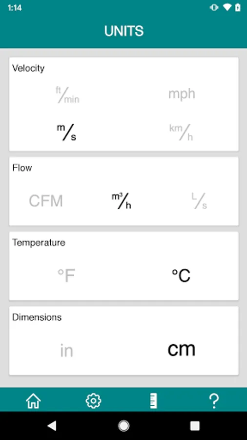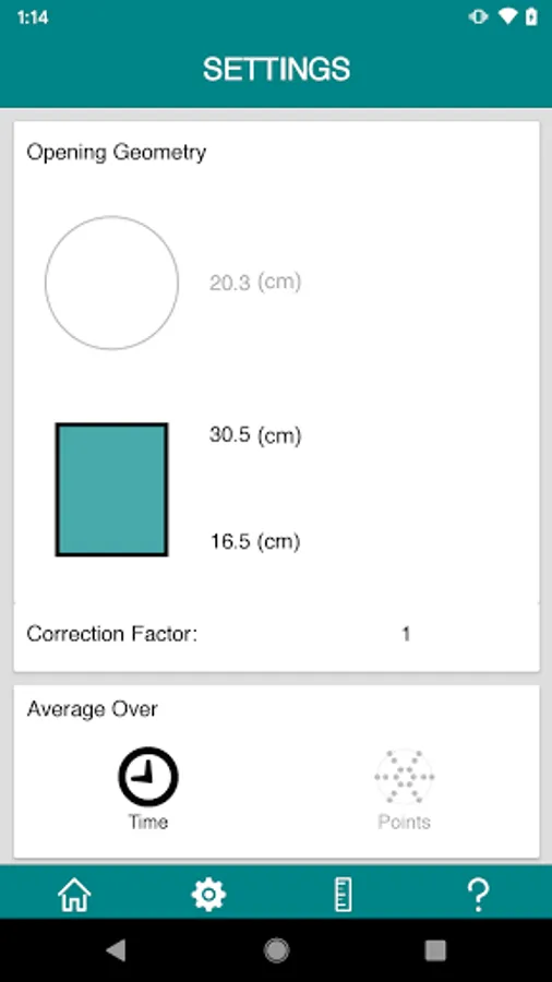 The app allows you to adjust for Round or Rectangular Ducting (in or cm) as well as take Averages over Time or Average via Point readings.