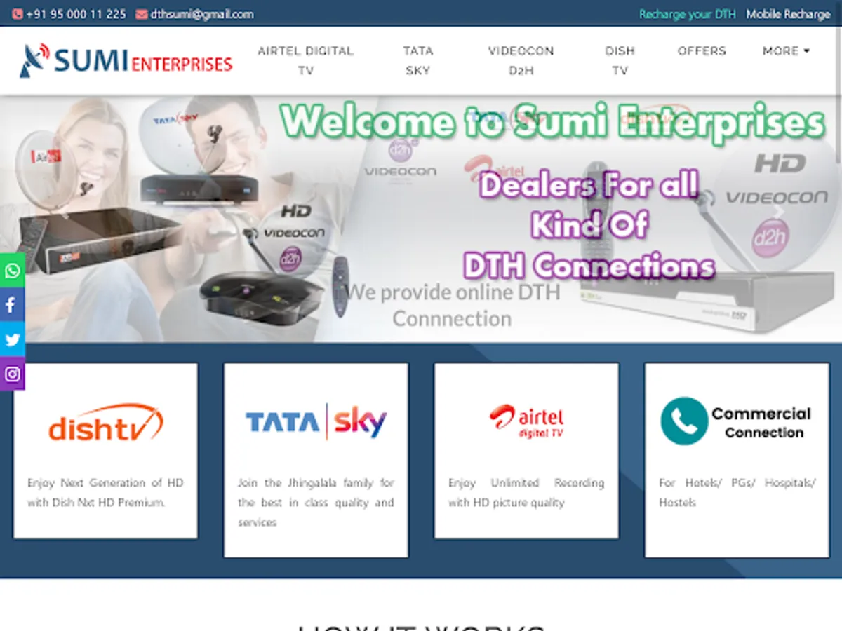 Sumi Enterprises is an online platform to compare and buy DTH Set Top Box with best offers and plans. We are the pan India authorized sellers of all major DTH Service providers including Dish TV, Tata Sky, Videocon D2H and Airtel Digital TV. With DTH Connect, you can compare all the brands- their features, packages and prices- and order the same online at the click of a button.