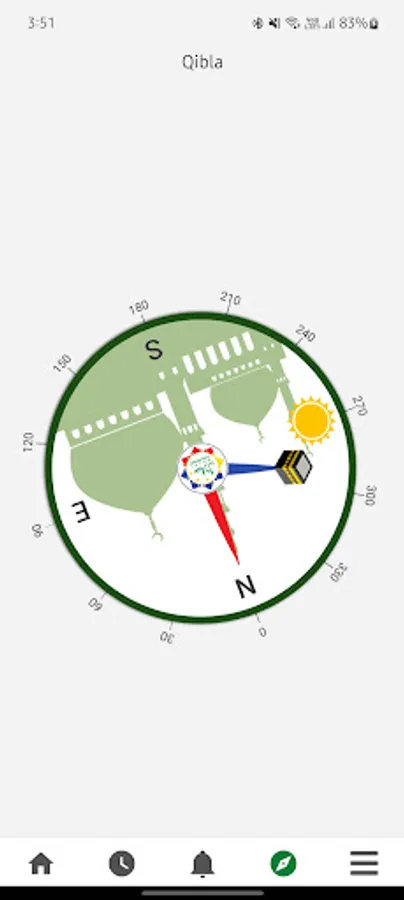 E. Qibla ( Prayer Direction ) - Fixed direction towards the Ka`bah in the grand mosque in Makkah, Saudi Arabia, direction which all Muslims face when performing their prayers wherever in the world.