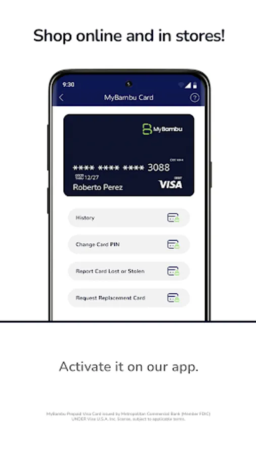 -MyBambu Prepaid Debit Visa Card: By using this card, you agree to the terms and conditions of the cardholder agreement and fee schedule, if any. The MyBambu Prepaid Visa Card is issued by Metropolitan Commercial Bank (Member FDIC) pursuant to a license from Visa U.S.A. Inc. “Metropolitan Commercial Bank” and “Metropolitan” are registered trademarks of Metropolitan Commercial Bank ©2014.