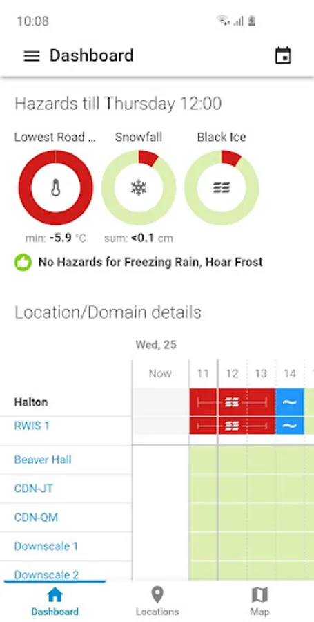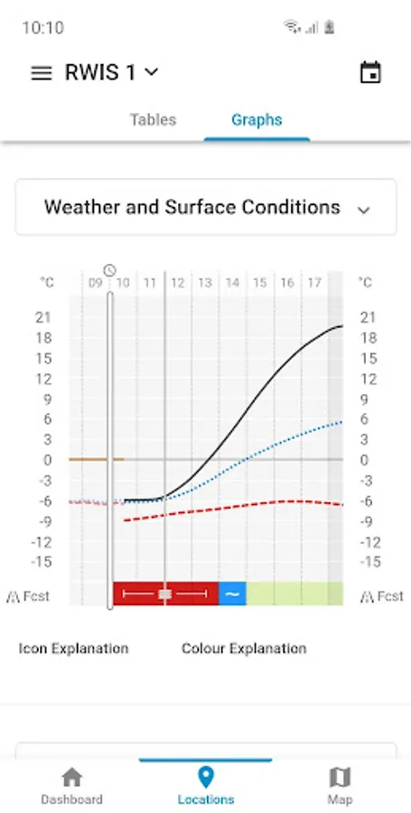 The RoadMaster dashboard provides alerts when slippery conditions are forecast or when the amount of snow or maximum wind gusts are forecast to exceed a pre-determined threshold in the next 24 hours. The dashboard also displays more detailed information such as minimum road surface temperatures and the road conditions for local Road Weather Information Systems and domains. Hourly road weather forecasts are presented in easy to use colour-coded tables and graphs.