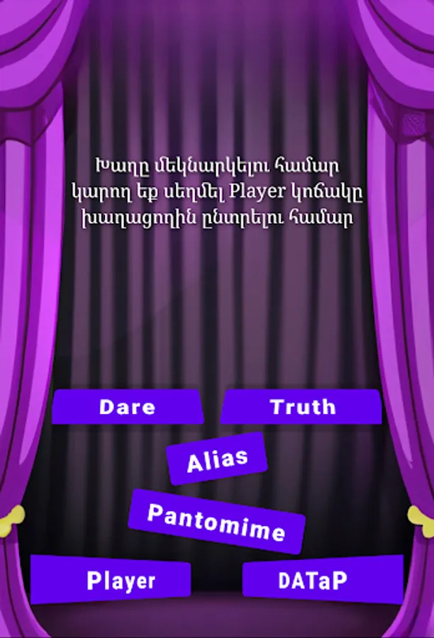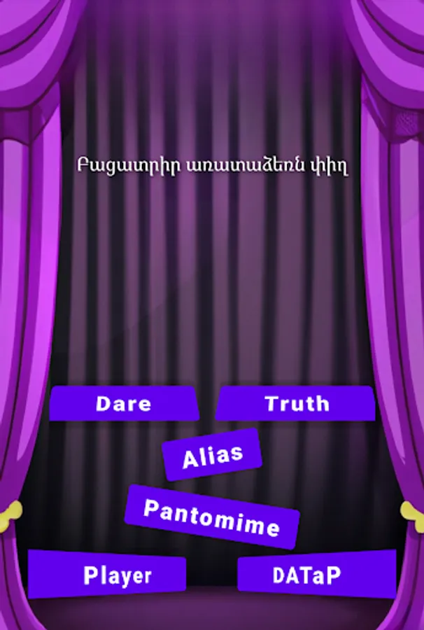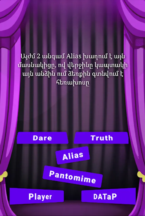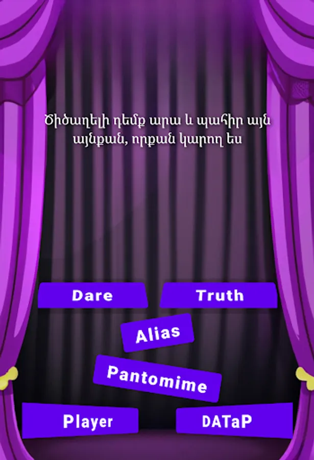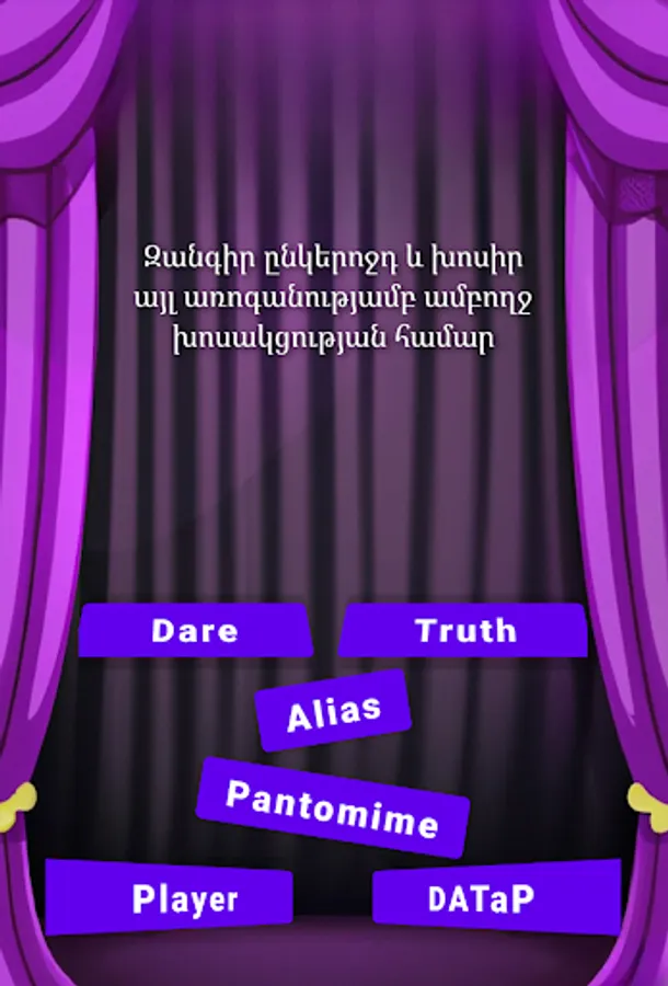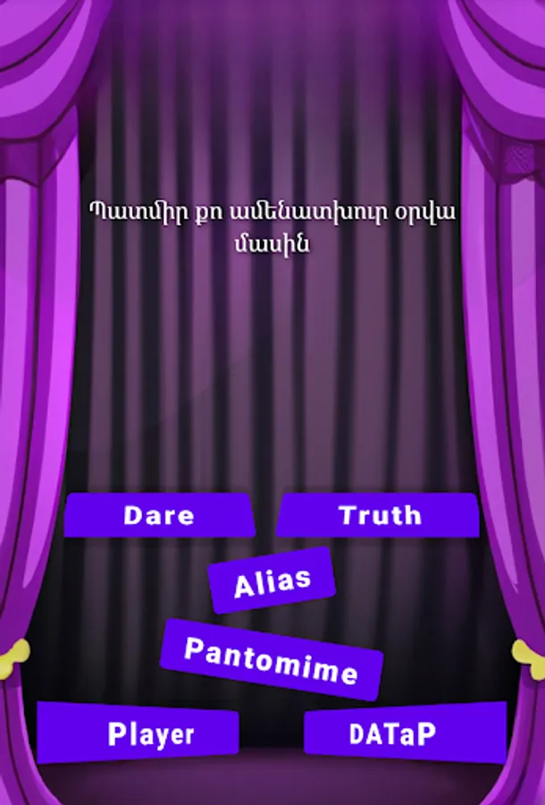 Dare Alias Truth and Pantomime is a multiplayer Armenian party game for Android users who love to play games with friends and family. Armenian language app offers four different game modes: Dare, Truth, Alias, and Pantomime. Players can choose their preferred mode and play with friends and family, providing endless hours of fun and laughter.
