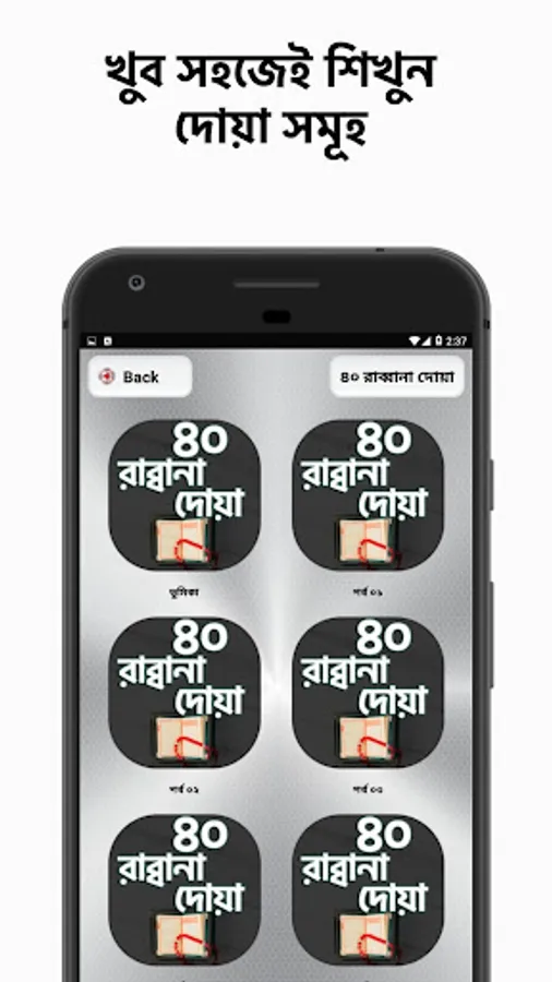এই অ্যাপ্লিকেশনটি 40 টি রব্বানা দোয়া রয়েছে যার মধ্যে আরবি সংস্করণ, লিপিবদ্ধকরণ, অনুবাদ ও গুরুত্ব বাংলাতে রয়েছে।