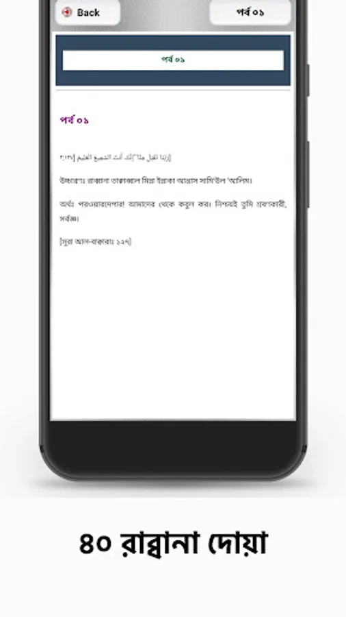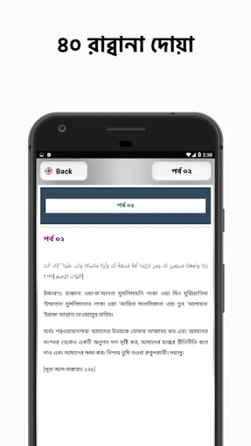 This application contains 40 Rabbana dua with Arabic version of it, transliteration, translation and Importance in Bengali.