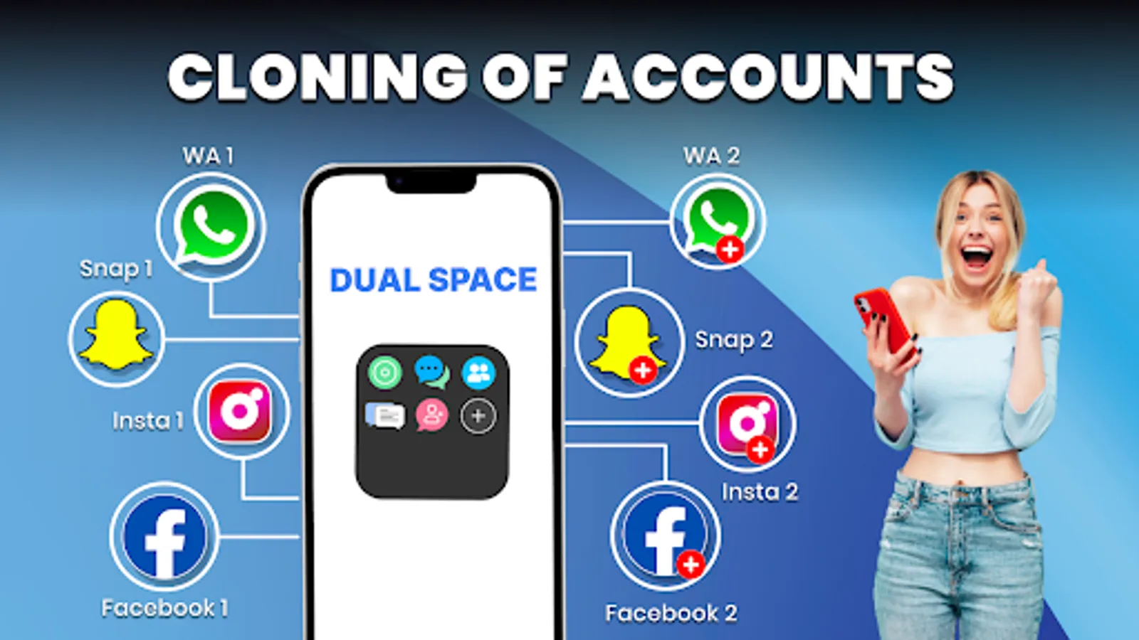 Dual space Multiple Accounts cloning app has a function of appclone, it takes multi social apps and via free app cloner i.e. a super cloner, clone games & clone app. Dual space free contains extra space storage plus to maintain and run multi accounts in Parallel. App cloner takes social media applications, app duplicator creates app clone & puts dual account in second space of multiapp.