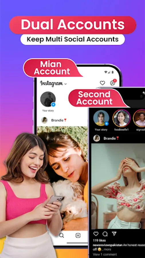 Dual Space pro: Parallel space & Multiple Accounts is a best app cloner. keep your multiple accounts login by creating extra space storage in your mobile device. dual space clone is a latest technology which creates extra space storage for two accounts & second space in your mobile phone. Free dual space app allows user to maintain & run two accounts multiple accounts of social media apps simultaneously. Dual app creates customize space of all cloned apps of social media network and games clone.
