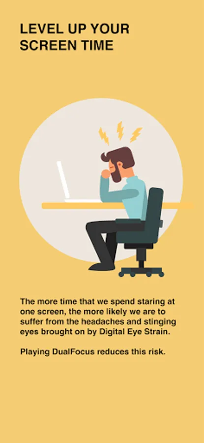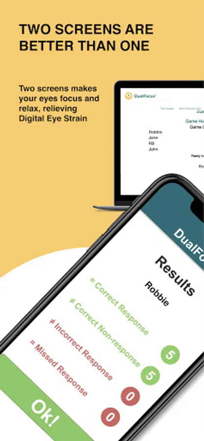 The DualFocus idea was first conceived of and executed to help young school children with deteriorating vision over 20 years ago, before smartphones and apps even existed. With the advent of smartphones, apps and our focus on screen based activities, we have adapted DualFocus into an app based game that anyone can play, even with friends that are miles away. DualFocus is designed so that your eyes will naturally refocus between two screens while playing, providing a fun and simple way relax to your eyes!