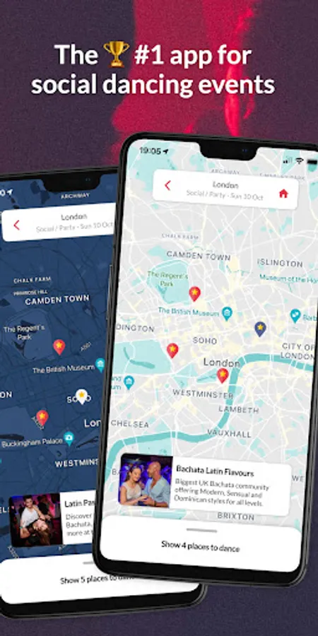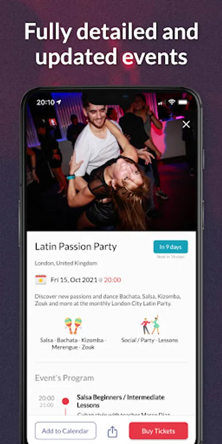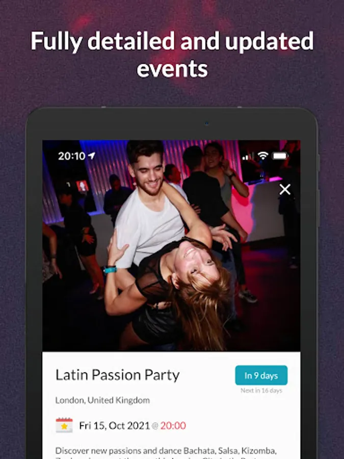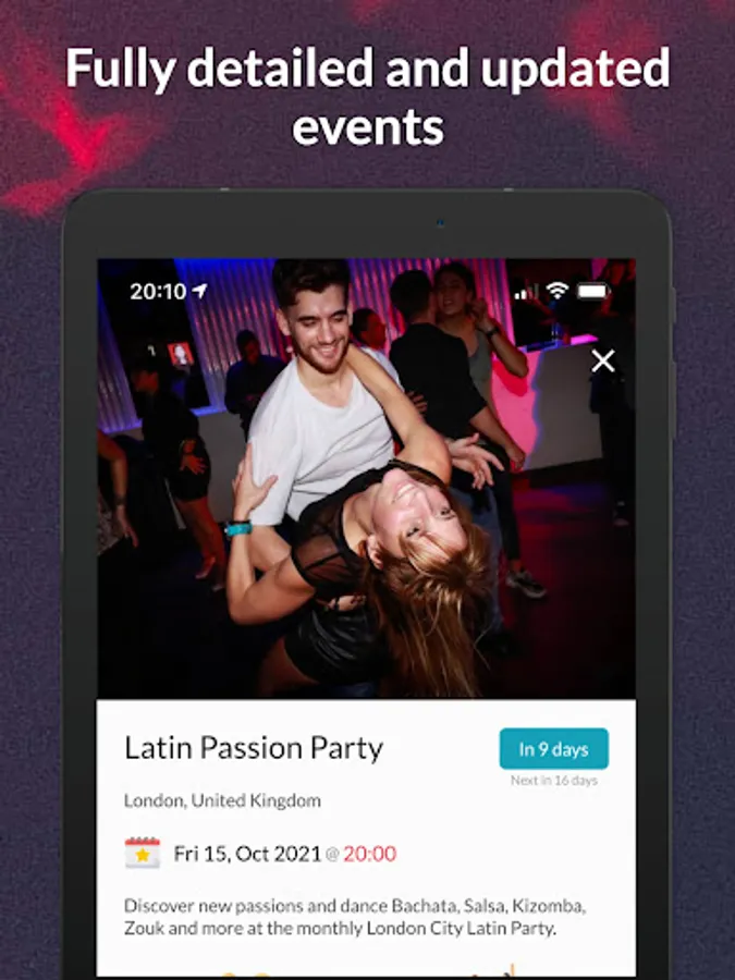 • Locate popular dancing events happening near you or upcoming ones in different cities on any date.