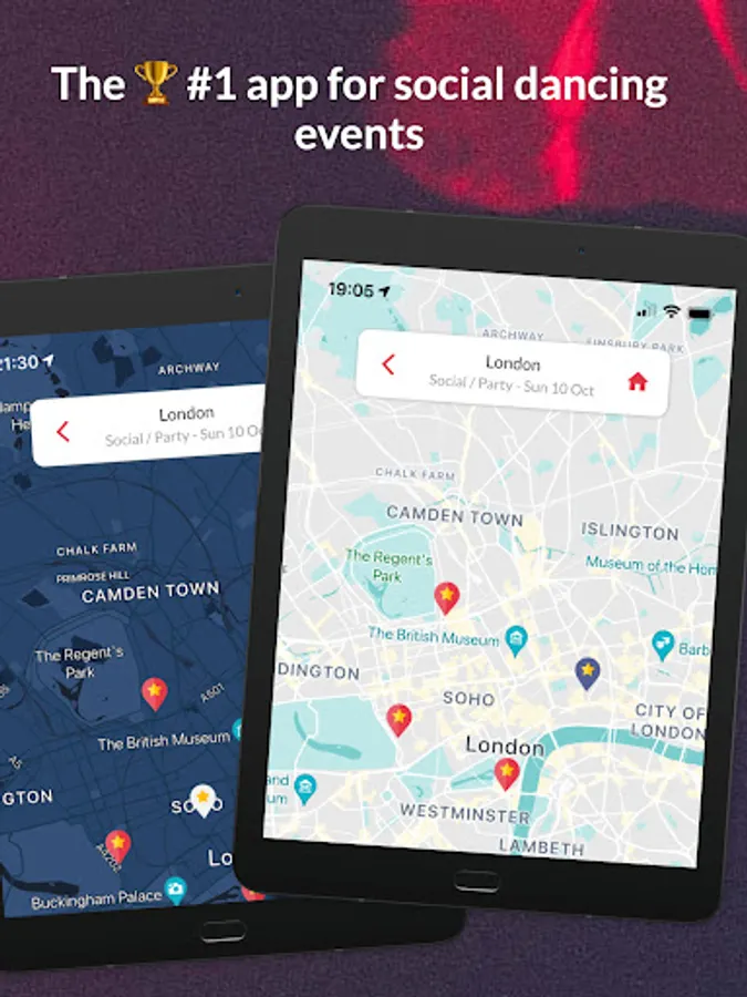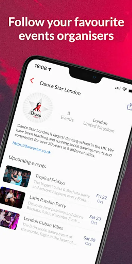 Dancing events organisers publish their weekly or monthly events, providing fully updated information to increase their exposure to users. Optionally, they can create tickets to be purchased through the app. Users can share the events and purchase their tickets online.