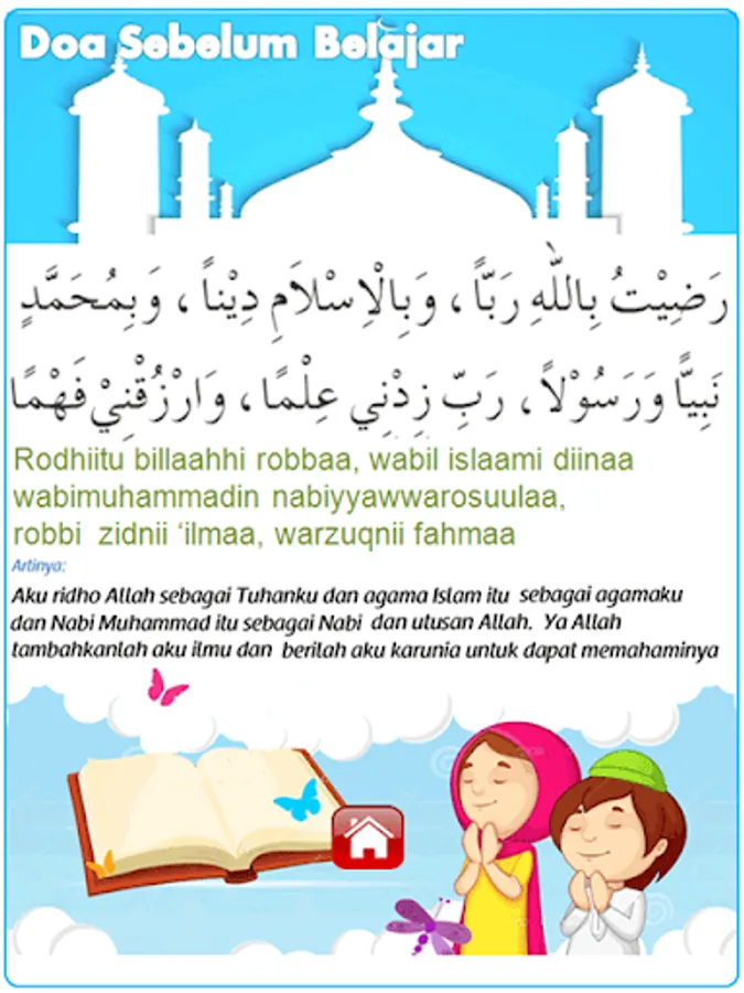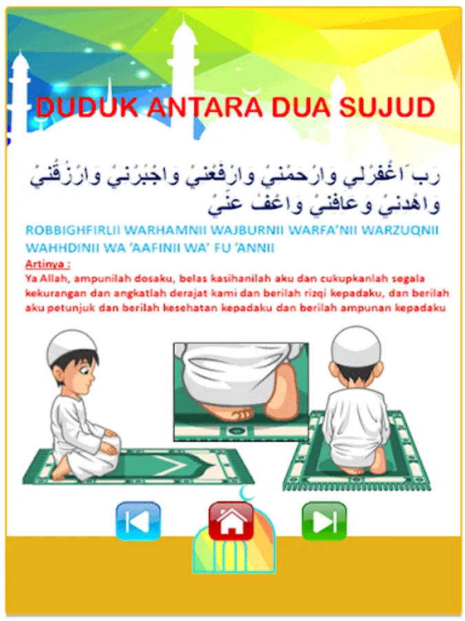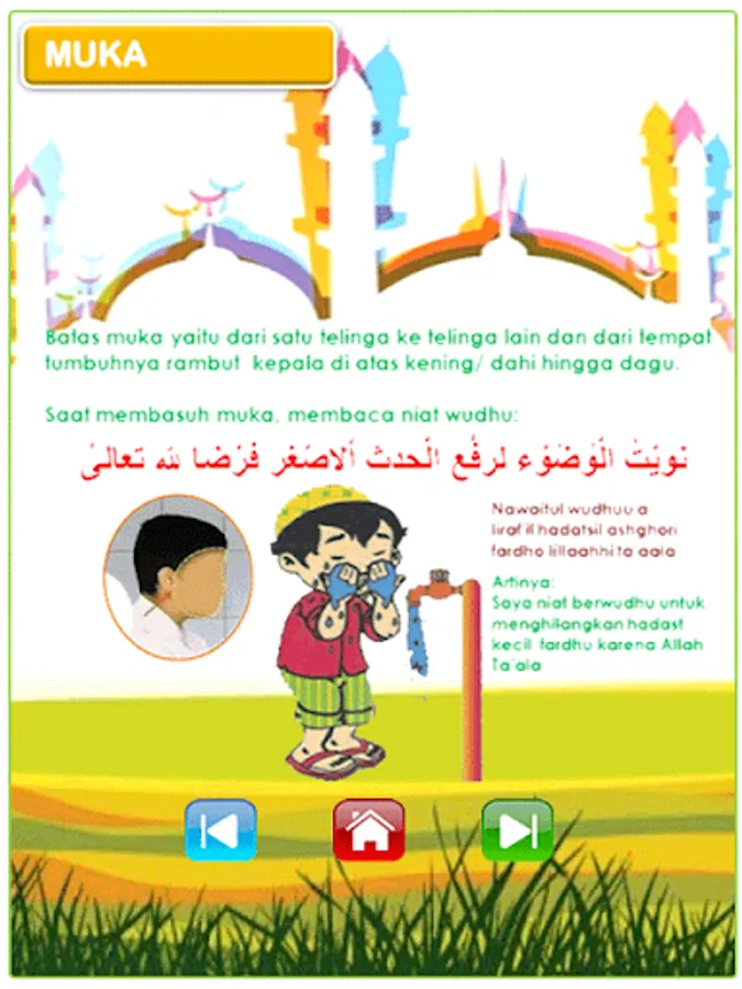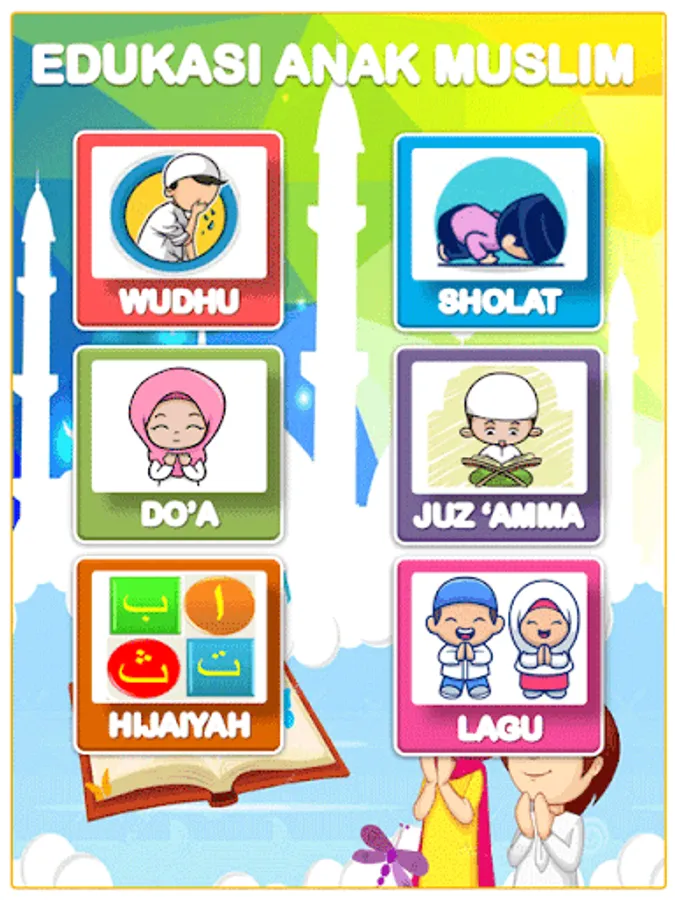 Offline games which are educational games to teach your favorite children, especially pre-school age, to learn ablution; prayer; children's prayer (praying); juz 'amma (short letters read after Al Fatihah at prayer) and hijaiyah letters. This application also adds children's songs which contain the main teachings in Islam such as the pillars of faith, the pillars of Islam, etc. This application is equipped with audio and text.
