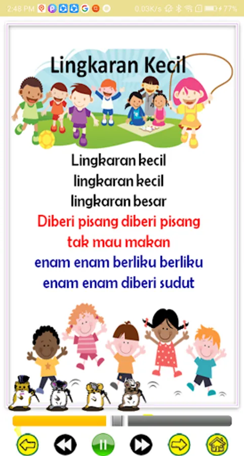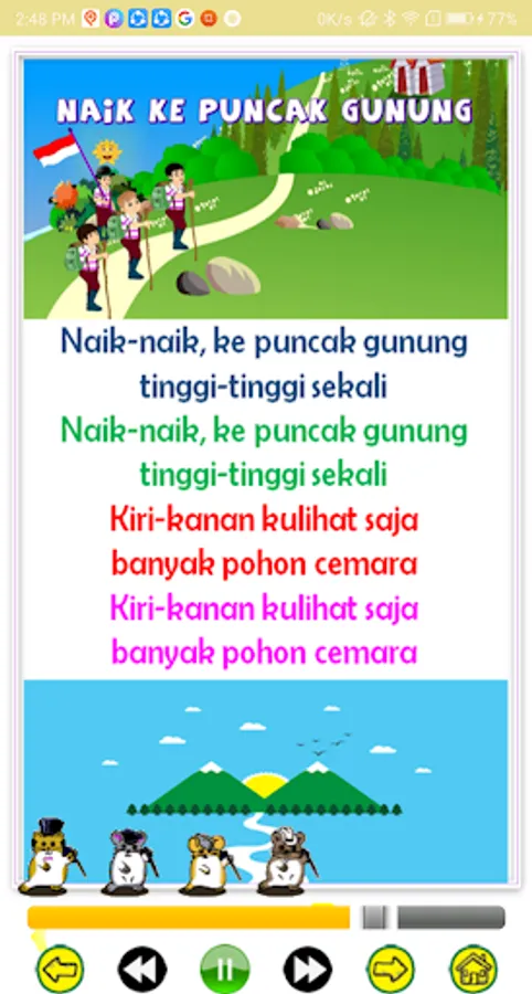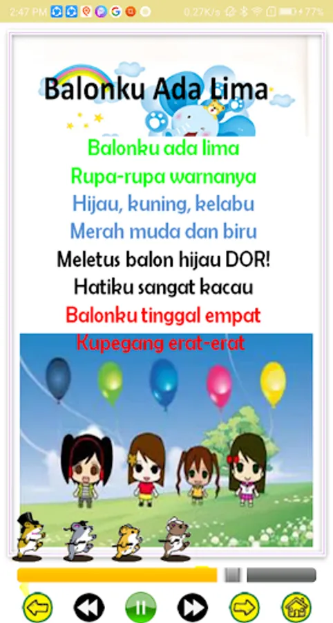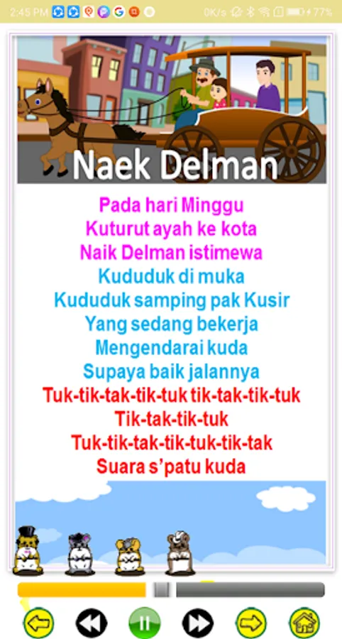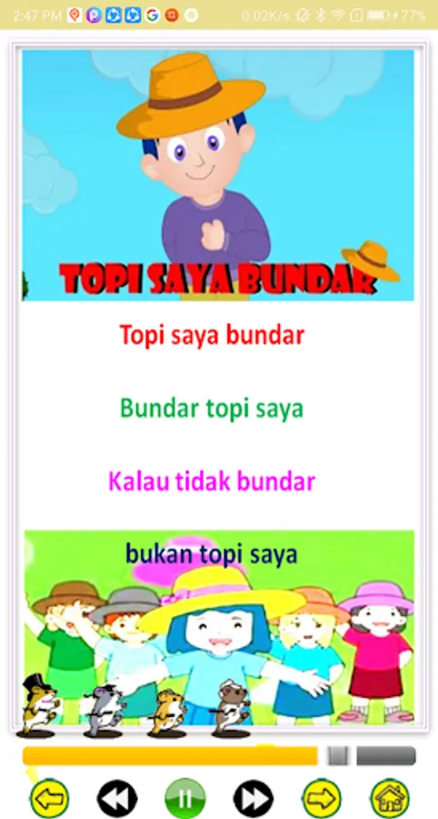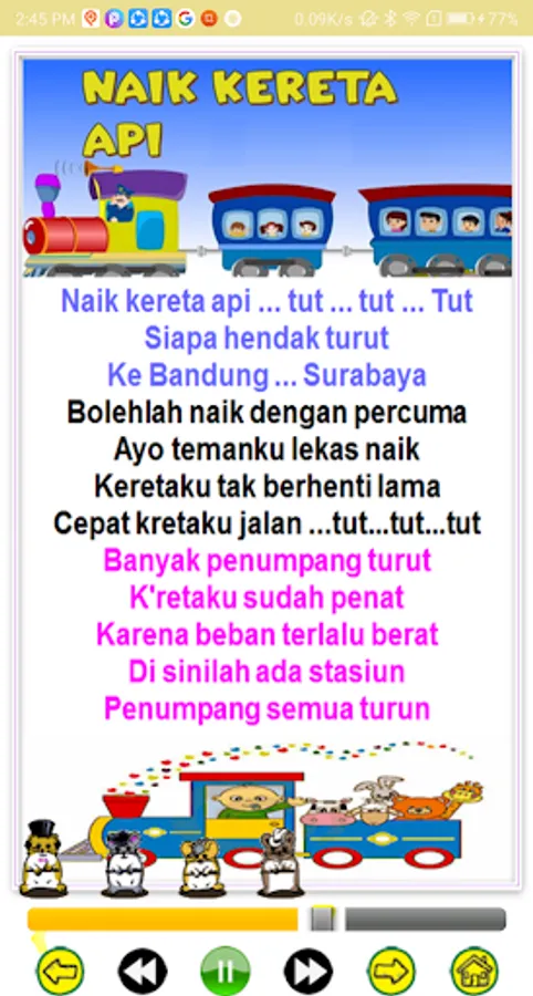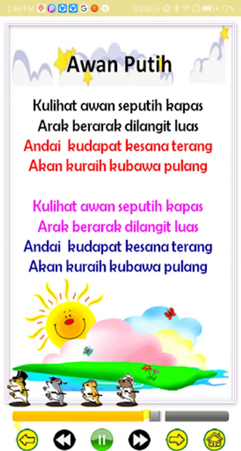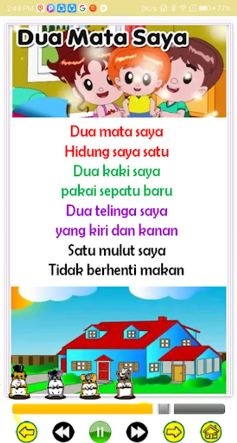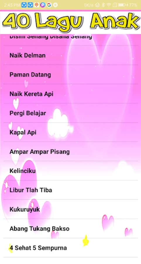 Indonesian child song is an application that contains a collection of popular children's songs with songs suitable for the child's pet. With a single install our children can enjoy and listen to them offline without the need for an Internet connection again.