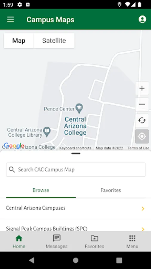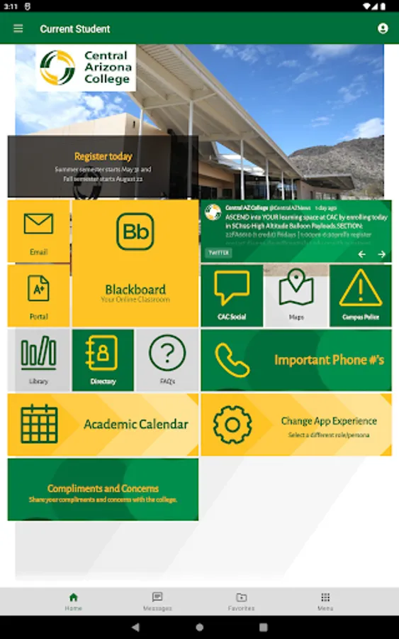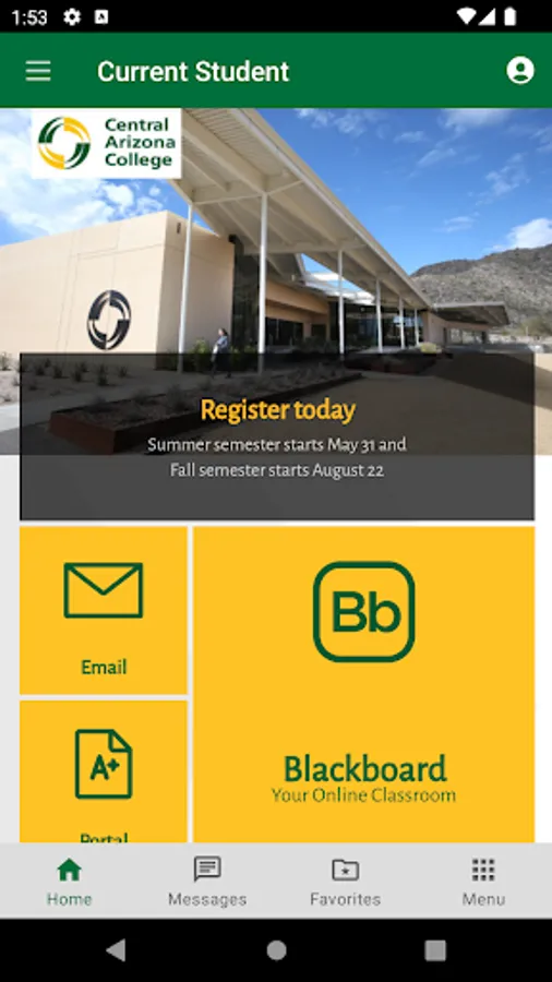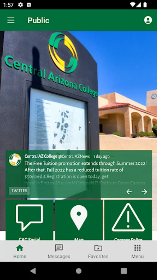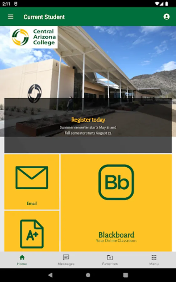 The Central Arizona College app brings the campus to your fingertips and enables you to connect with the CAC community whether you are a future student, current student, employee or community member. Be notified of important dates, deadlines, and security announcements. Access campus resources and technology 24/7.