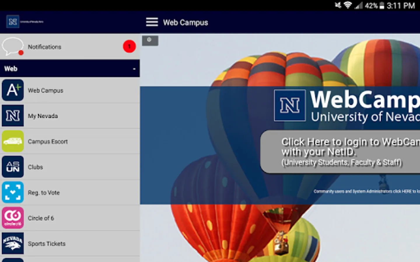 The University of Nevada, Reno App brings campus to your fingertips and enables you to connect with the [campus acronym] community: Stay on top of your events, classes, and assignments with the built in calendar function, and get notified of important dates, deadlines & security announcements. Make friends, ask questions, and access campus resources at any time!