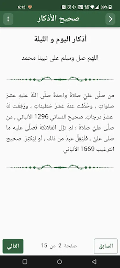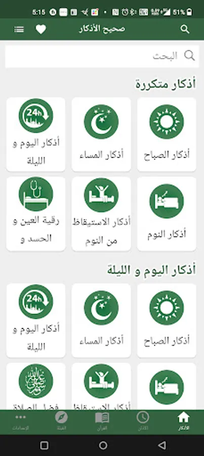 The application, after the eighth update, includes the correct Azkar, prayer times, the direction of the qiblah, and the simplified Qur'an for reading, which includes the simplified interpretation of Saadi, as well as English translation and parsing.