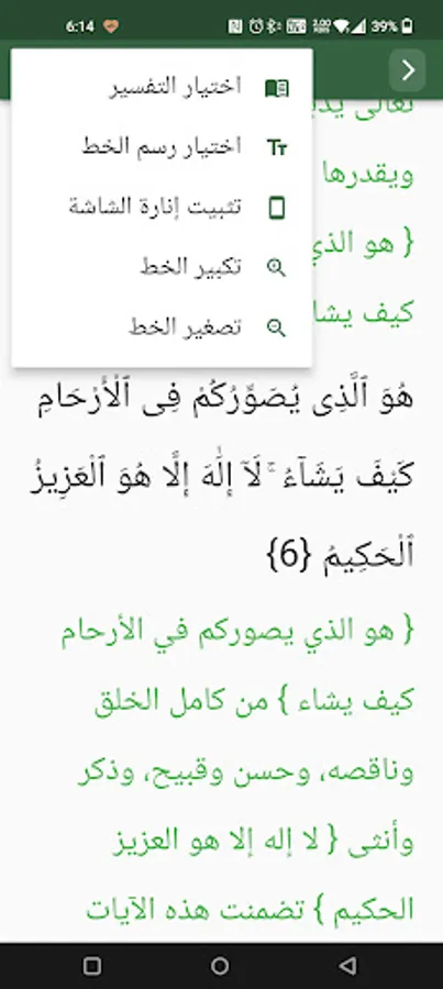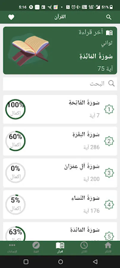 The application after the eighth update includes the correct dhikr, prayer times, the direction of the qiblah, and the simplified Qur’an for reading, which includes the simplified interpretation of Saadi, as well as English translation and parsing.