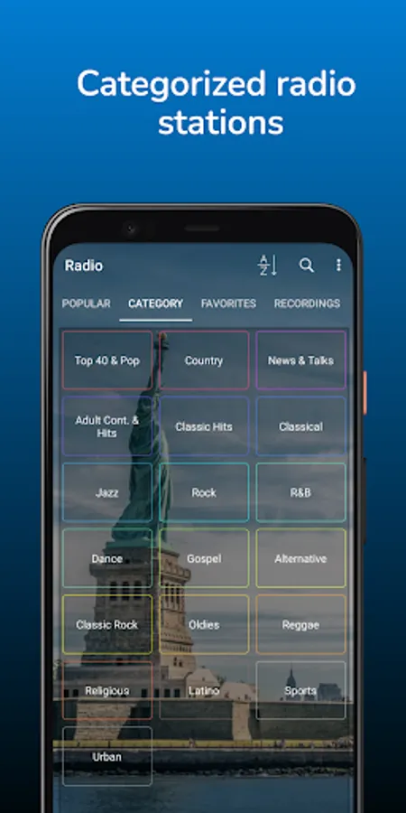 - The application contains many radio stations category such as pop, rock, jazz, country, news & talks, urban and so many.