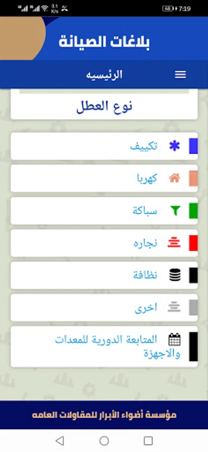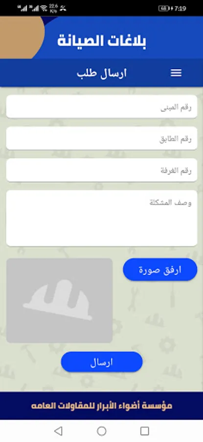 بلاغات الصيانة هو تطبيق يساعدك علي طلب مختص لاصلاح عطل فني او مشكله تعاني منها عن طريق ارسال طلب يتضمن رقم المبني، رقم الطابق، رقم الغرفة، وصف تفاصيل المشكلة و ارفاق صورة اذا امكن